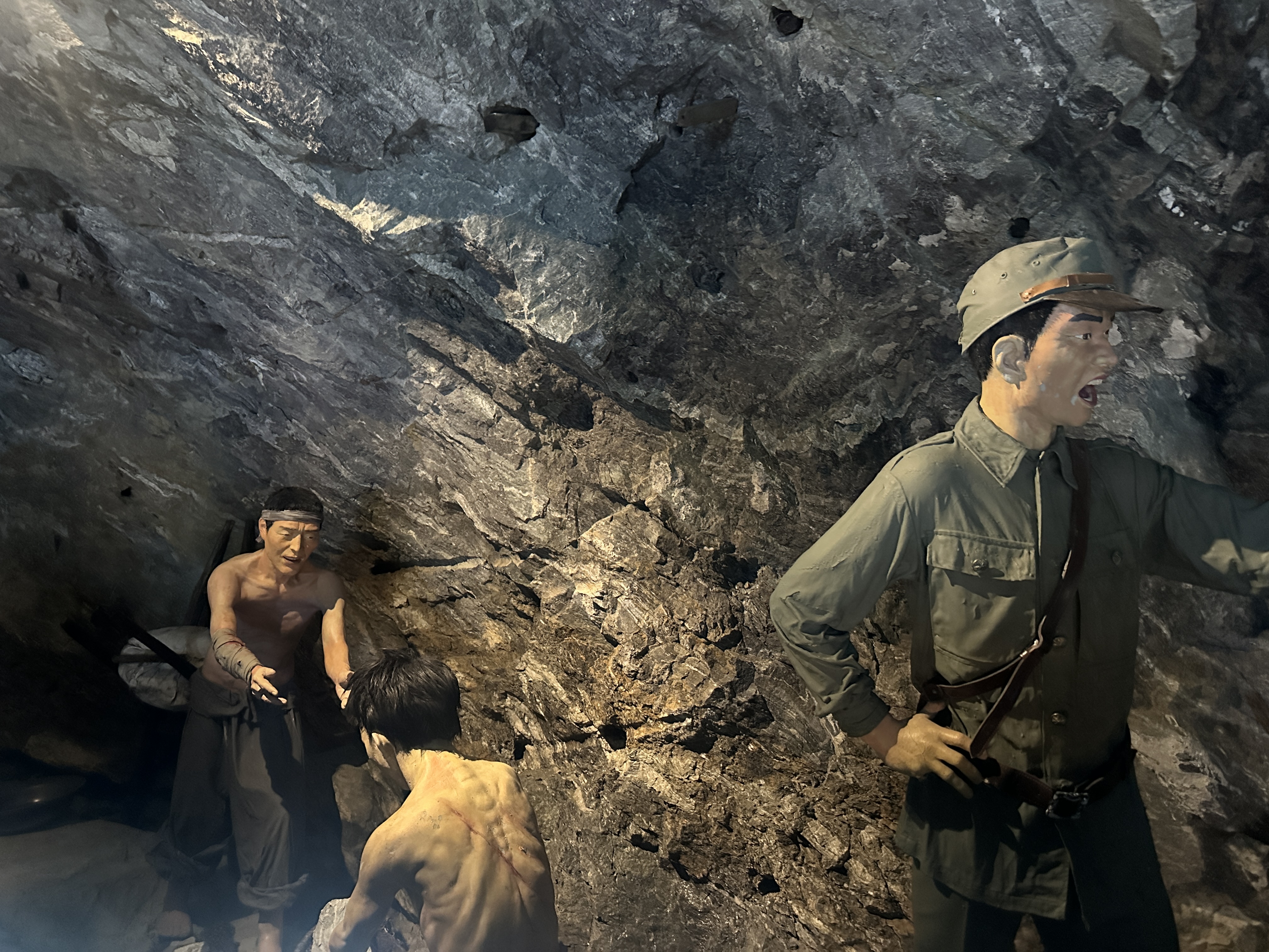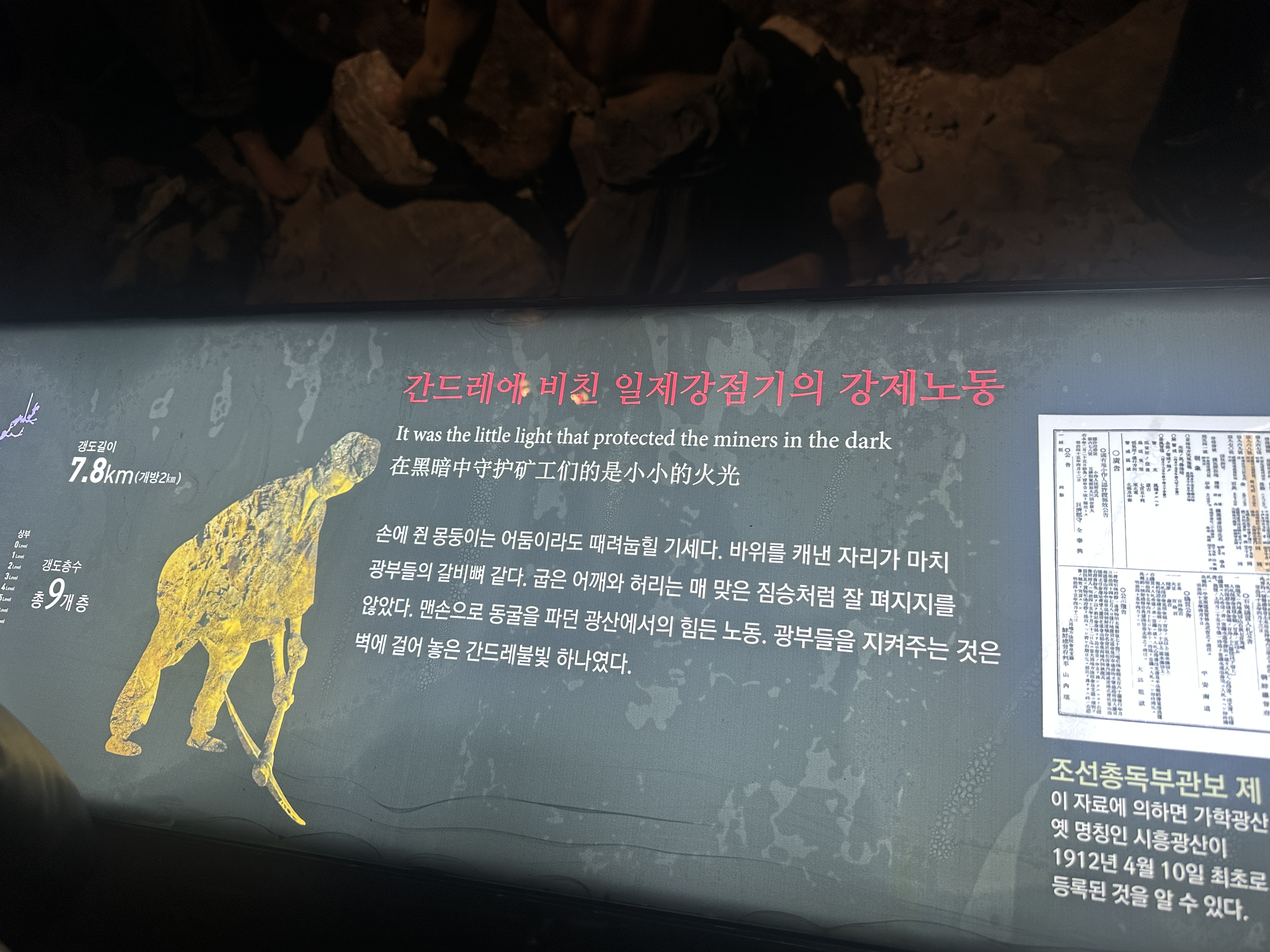 광물 채광량을 보고 감탄에 빠져들었던 것도 잠시, 광명동굴은 사실 뼈아픈 역사적 사실이 함께 존재했습니다. 광명동굴은 일제 강점기 시절, 1912년부터 어쩔 수 없이 끌려가 목숨을 걸고 탄광을 파고들어야만 했던 일제의 강제 노역이 그 첫 시작이었던 것입니다. 곳곳에 적혀진 그 시절의 핍박과 고단함 그리고 그 모습을 조금이나마 직관적으로 보여주기 위해 재현되어 있던 모형들. 어쩌면 어둠보다 더 어두운 곳에서 심연보다 더 깊은 곳을 파고들 수밖에 없던 그 시절, 살이 찢어지고 뼈가 부서지는 고통을 이겨낼 수밖에 없던 그 처참함을 보면 괜스레 죄송스러운 마음이 들고 가슴 한편이 먹먹해져옵니다.