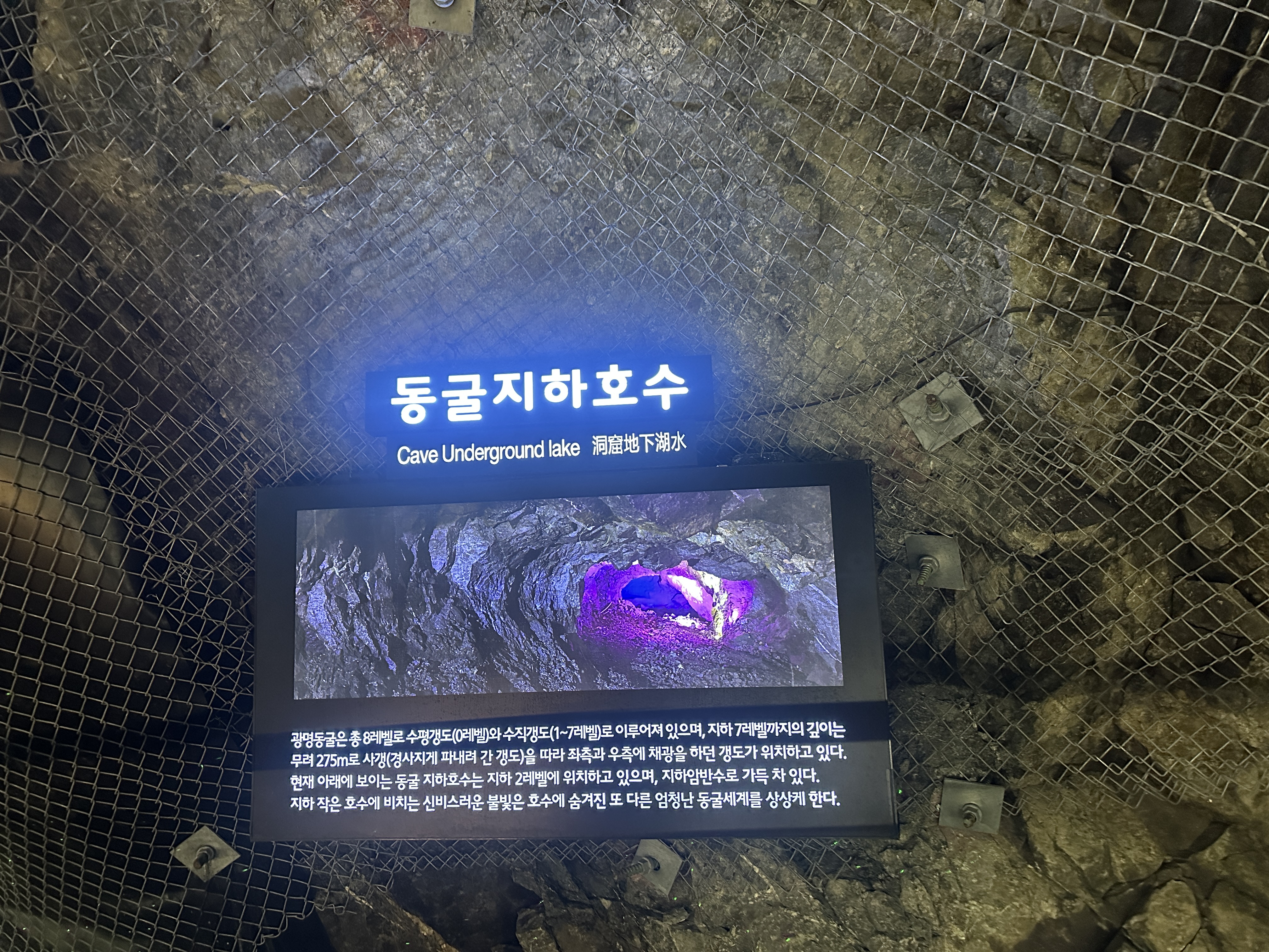 앞뒤뿐만이 아니라, 좌우까지 깊숙이 뻥 뚫려 있는 동굴 숲을 전체적으로 훑어가다 보면 미지의 세계를 상상케 하는 동굴 지하 호수가 눈에 걸리게 됩니다. 사실, 좌우를 유심히 살피지 않더라도 호수가 내뿜는 그 거대한 존재감이 사람들의 시선을 사로잡게 될 것이라고 생각합니다. 개척된 탐방로가 아니라서 가까이서 볼 수는 없지만 그래서 더 상상력을 자극하고 신비롭습니다. 지하 호수 외벽에 한 층 한 층 겹겹이 쌓여 새어 나오는 오묘한 색감의 빛들이 미스테리함과 호기심을 더하는데 큰 몫을 하는 것 같습니다. 처음 보자마자, 어릴 적 판타지 영화나 TV만화에서 자주 등장하던 마법 같은 존재나 전설적인 무언가가 호수 깊숙이 존재하고 있는 것 같은 상상이 듭니다.