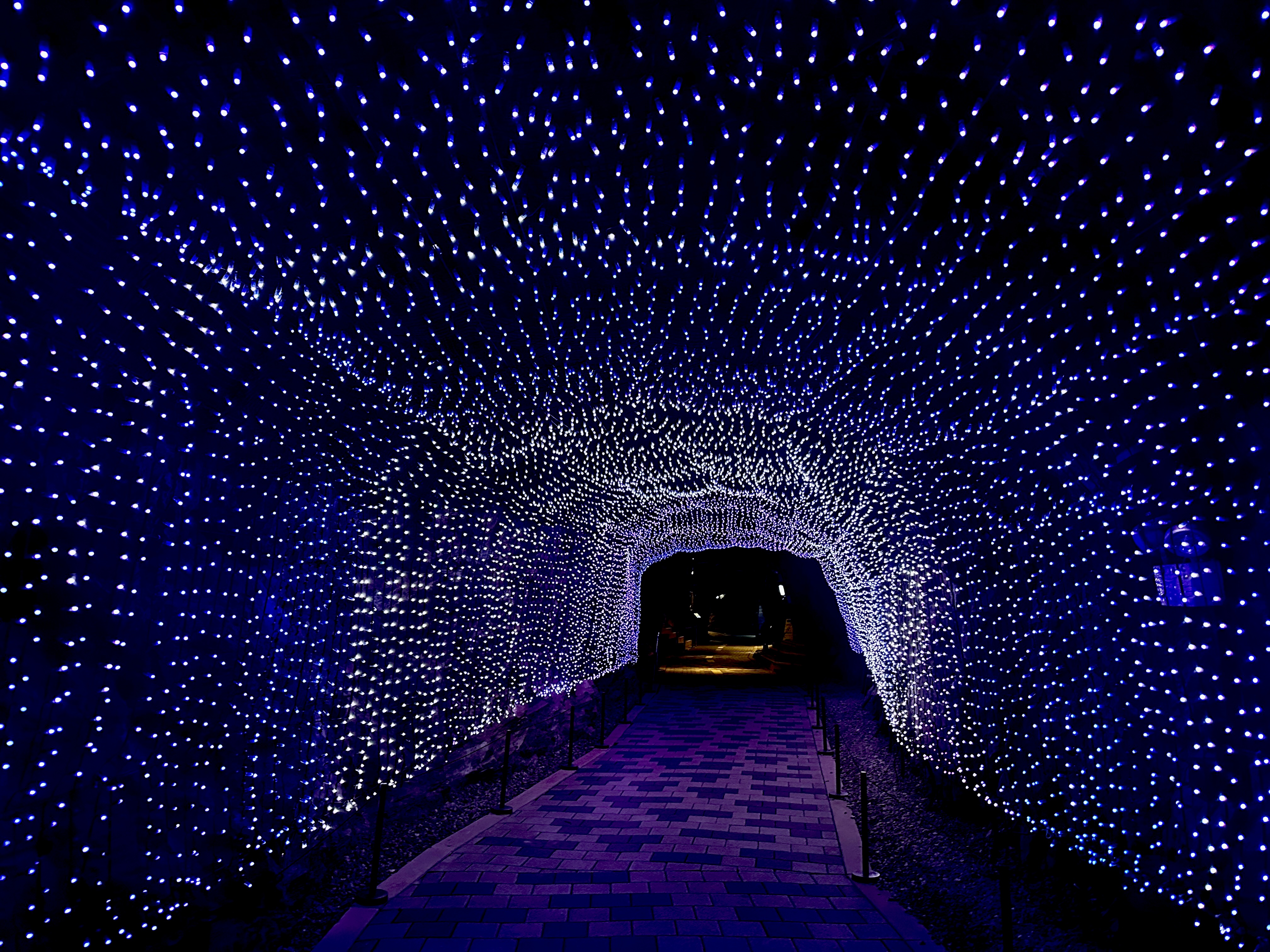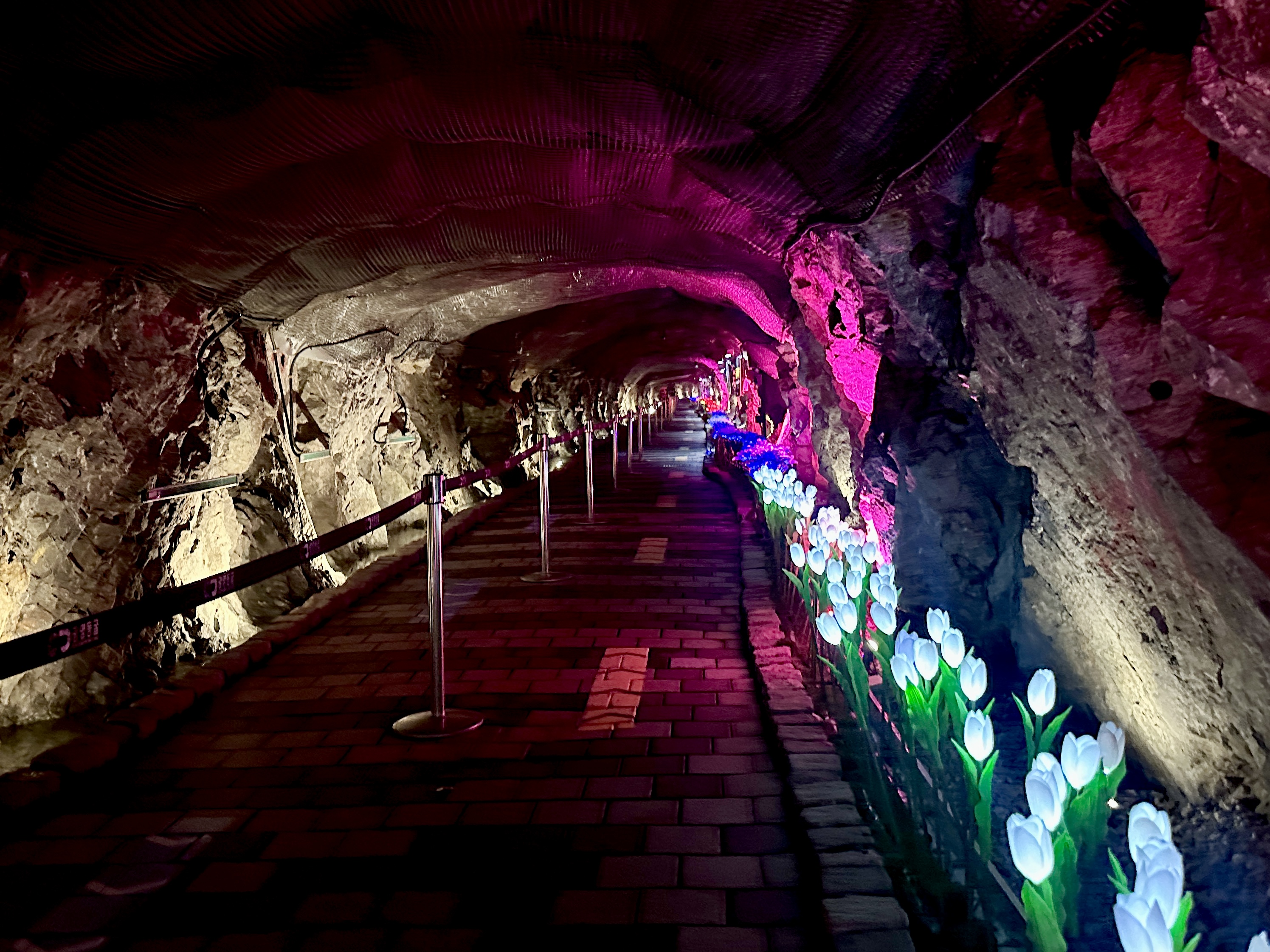 웜홀광장을 지나 암반을 따라 이어지는 빛의 공간으로 발걸음을 옮기면, 동굴의 분위기는 다시 한번 바뀝니다. 조명은 공간을 드러내기보다는 길을 안내하는 역할에 가깝고, 자연스럽게 시선은 위와 옆으로 향하게 됩니다. 암반을 따라 번지는 빛의 화려함이, 연말의 풍경을 떠올리게 했습니다.
