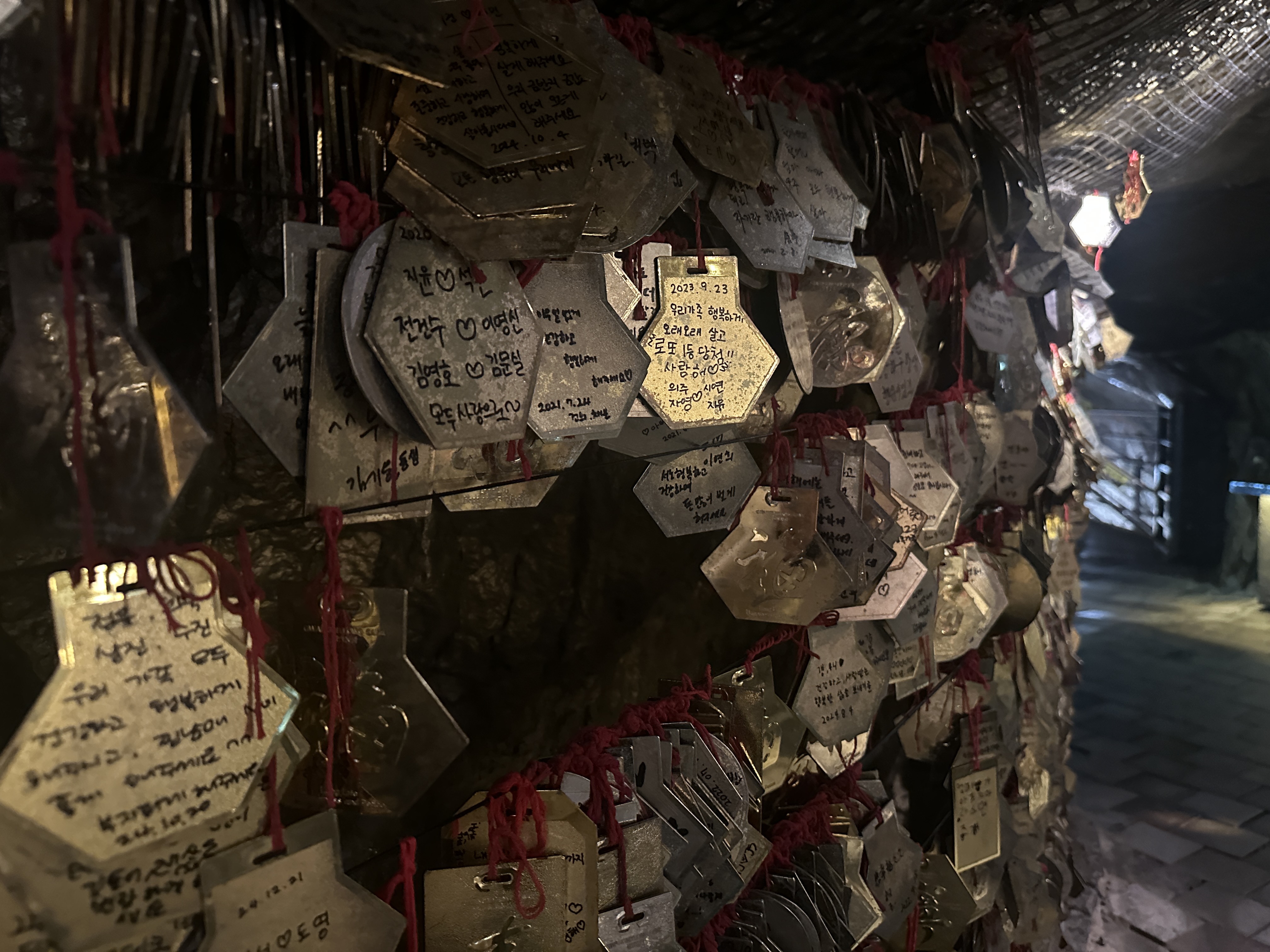 광명동굴이 예전부터 금을 채광하던 갱이라 그런지 이동하는 곳곳에 금의 흔적들이 가득합니다. 천장과 벽면에 붙어있는 있는 금장식과 통로에 걸려 있는 소원 적힌 황금패, 황금동상 등등. 연말인데다 소원 적힌 황금패를 보니, 저도 황금패에 소원을 적어 걸어놓고 싶었는데 황금패를 파는듯하는 매대는 있었지만 이날은 아쉽게도 운영을 안 하고 있었습니다. 비록 소원을 적진 못했지만, 소원을 이뤄주는 다른 황금 조형물들 앞에서 바라던 소원을 빌고 왔습니다. 후에 동굴투어를 다 끝내고 나서 알고 보니, 들어가는 입구에서 5천 원에 구매할 수 있다고 하니, 황금패에 소원을 적어 걸어놓고 싶으시다면 입구에서부터 구매하셔서 준비해 가시는 걸 추천드립니다.