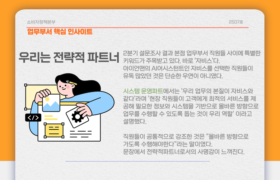 “예를 들어 시스템 개발 부서나 비용 관리 부서 직원이라면 내 업무가 소비자와 무슨 상관이 있는지 체감하기 어려울 수 있습니다. 그래서 전참시 형식으로 다른 부서 동료들이 어떻게 소비자중심경영을 자신의 업무와 연결해서 생각하는지 보여 주려고 했습니다. 내 업무가 소비자에게 어떤 영향을 미치는지를 스스로 생각해보면서, 다른 동료들의 답변을 보기도 하고 결국 '우리 모두가 소비자를 위해 일을 하고 있구나’를 체감하게 되는 것이죠. 결국 CCM이 우리 일상 업무의 자연스러운 일부가 되도록 하는 것이 목표예요.”