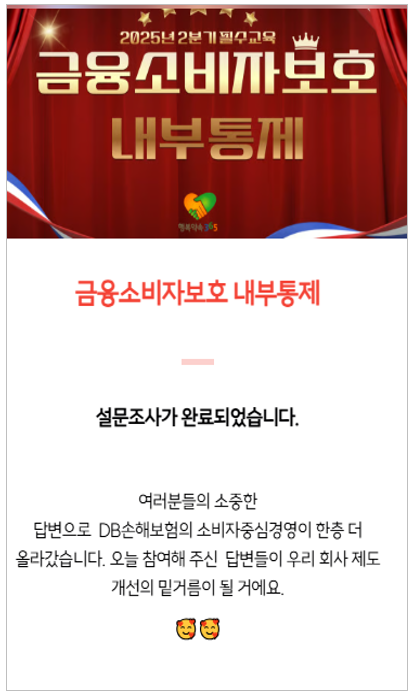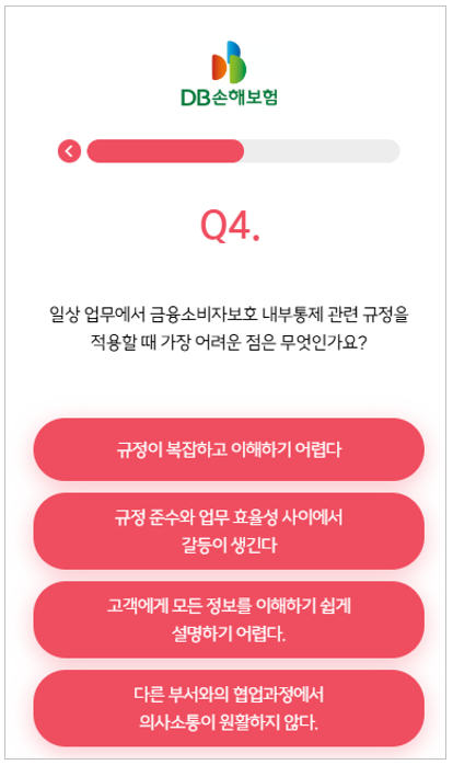 DB손해보험 소비자보호기획파트 양호진 책임은 “코로나 팬데믹을 거치며 CCM교육을 영상교육으로 시행했습니다. 대면교육이 어려워 만든 영상인데 영상 활용에 새롭게 접근해 보고 싶었어요. 기존에는 교육영상을 시청하는 데에 머물렀다면, 지금은 재미있는 소재를 발굴하고 영상 시청 후 부서별 토의를 거친 결과물과 직원들의 설문조사 내용을 토대로 소통 콘텐츠를 제작, 공유하는 방식으로 영상을 활용하고 있습니다.”라고 소개했다.
