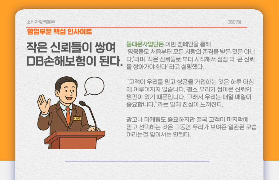 눈 앞의 업무에 쫓기다 보면 정작 잊지 말아야 할 기본을 놓칠 때가 있다. 기업은 소비자가 있기 때문에 영속된다. 기업 구성원의 마음 속에 소비중심 문화가 스며들어야 하는 이유다. DB손해보험은 동료의 생각과 얼굴을 통해 소비자중심경영 사례를 접하게 함으로써 공감과 자발적인 동기부여를 이끌어내고 있다. 이런 작은 활동들이 쌓여 소비자중심 문화가 내재화 되고, 대외적으로는 DB손해보험의 소비자보호 기업 이미지도 높아지고 있다. 2026년 소비자 중심으로 생각하는 DB손해보험의 CCM 활동이 또 어떻게 진일보할지 기대된다.