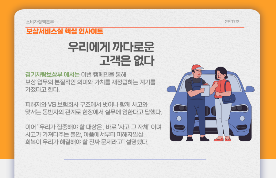 전직원 참여 CCM 활동을 이끌고 있는 소비자보호본부는 한 마디로 소비자를 위한 부서다. DB손해보험은 이전 소비자정책본부를 2025년 12월 1일 소비자보호본부로 개편했다. 금융감독기관이 요구하는 금융소비자보호와 나아가 소비자중심경영에 더 가까이 다가가기 위한 회사의 의지를 보여주는 단면이다.