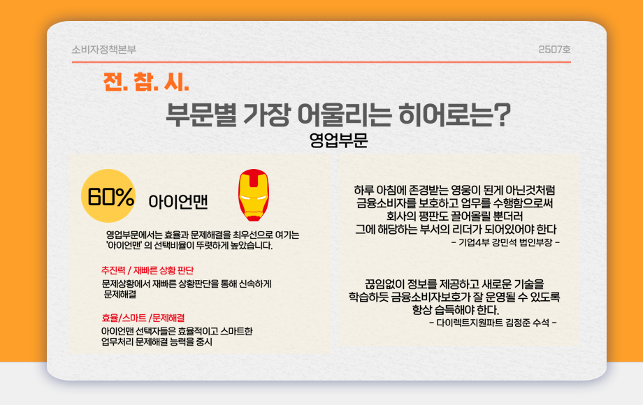 소비자보호기획파트에서는 이런 설문조사 결과를 취합하고 부문별로 어떤 캐릭터를 많이 선택했는지 재치 있게 풀이한 콘텐츠를 제작해 직원들이 금융소비자보호에 재미있게 다가갈 수 있도록 했다. 이런 콘텐츠는 분기마다 주제를 달리해 만들어진다.