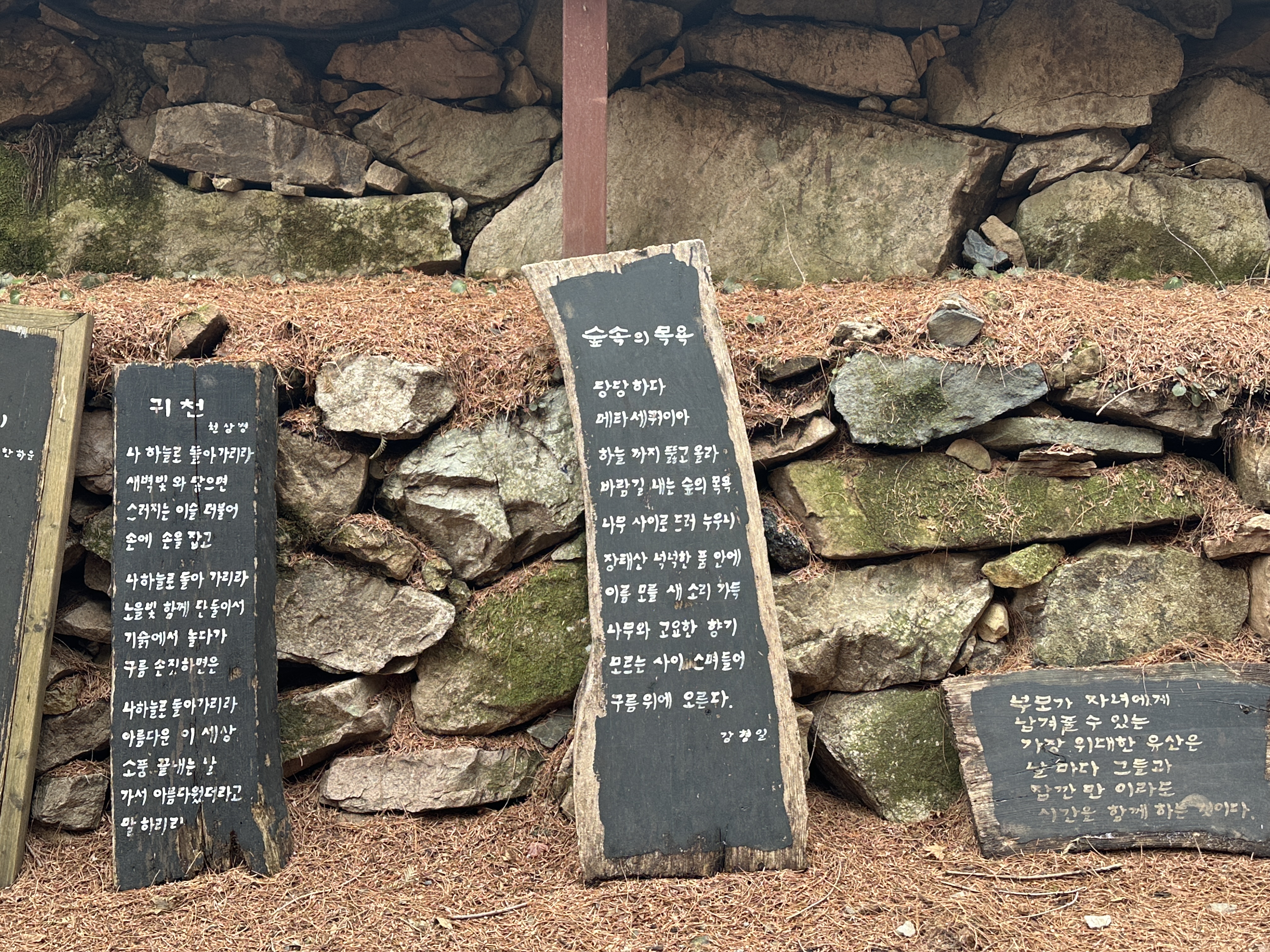 고요한 풍경에 혹시나 질리지 않도록 가는 길 곳곳에 시인들의 작품이 놓여 있었습니다. 이날 이 글들을 읽으면서 마음속에 왠지 모를 풍요로움까지 차오르게 됐었는데요. 숲이 무척 고요한 덕에 작품 하나하나에 온전히 집중해서 감상할 수 있었고, 여긴 마치 숲속 전시관에 방문한 것 같은 느낌마저 들었죠. 자세히 보면 그냥 작품을 전시해놓은 것이 아닌, 나무판자들을 활용했다는 걸 알 수 있는데, 이 또한 자연을 허투루 쓰지 않고 의미 있게 활용한 것 같아서 내심 흡족한 마음이 들었습니다.