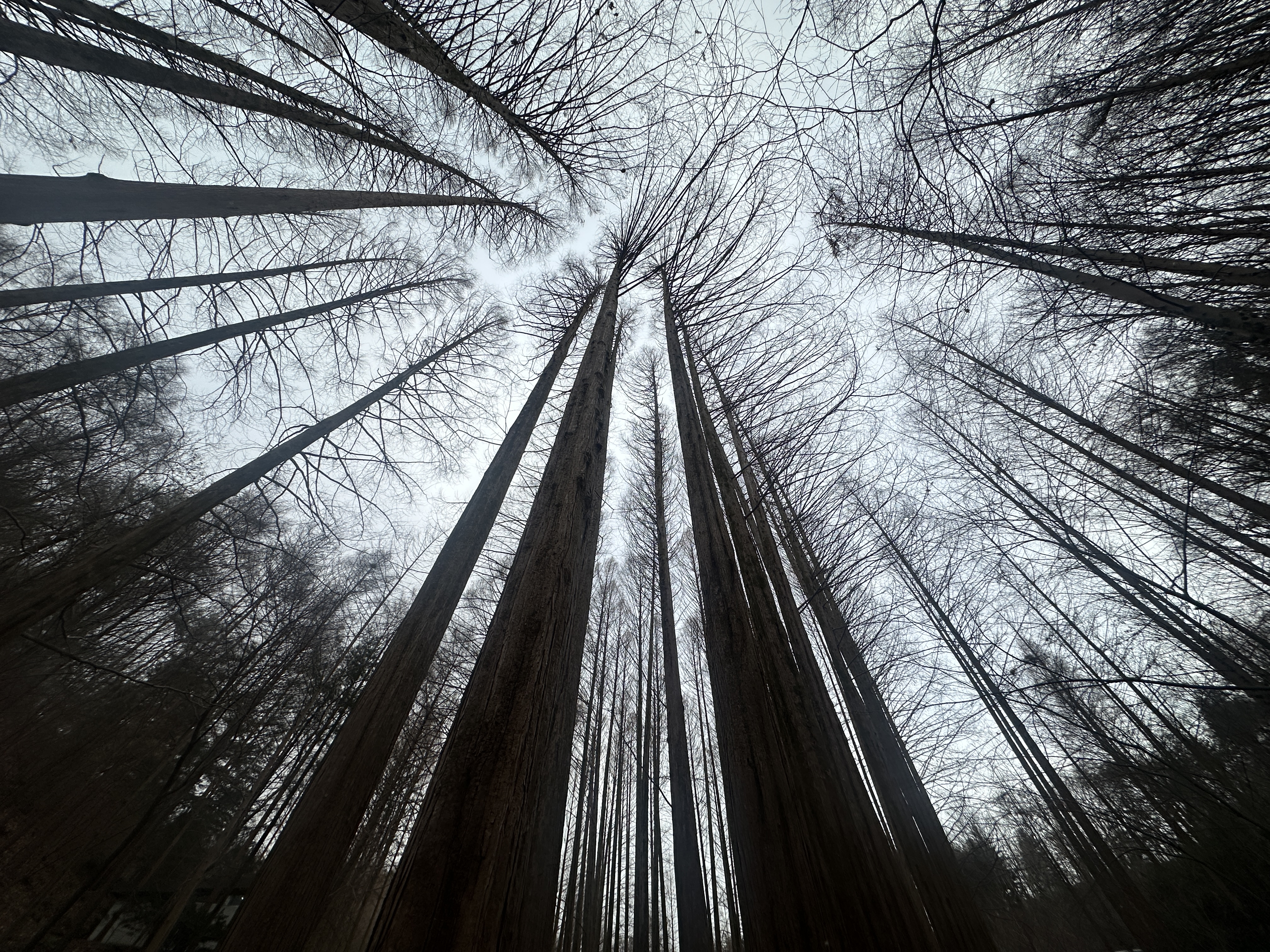 눈 송이가 하나 둘 떨어져, 문득 하늘을 올려다봤을 때, 또 한 번 숨을 멎게 되는 광경을 마주하였습니다. 하늘로 쭉 이어진 사다리처럼 하늘을 향해 손을 뻗고 있는 나무들의 모습이었죠. 제게는 마치 나무 본체가 하늘을 향해 쭉 뻗은 거대한 팔뚝 같았고 그 옆으로 돋아난 가지들은 그 팔뚝에 돋아나 있는 솜털처럼 보였습니다. 그래서인지 저도 모르게, 나무의 소실점을 향해 팔을 쭉 펴보곤 했었죠. 또 한 편으로는, 다람쥐나 다른 작고 귀여운 동물들이 나무들을 놀이기구 삼아 신나게 오르락내리락하며 놀고 있을 것 같은 상상까지 해보게 됐습니다. 얼핏 보면 섬뜩해 보일 수도 있지만, 이곳에서 느껴지는 특유의 따뜻함 덕분에 이런 생각과 상상도 해볼 수 있게 되는 거겠죠.