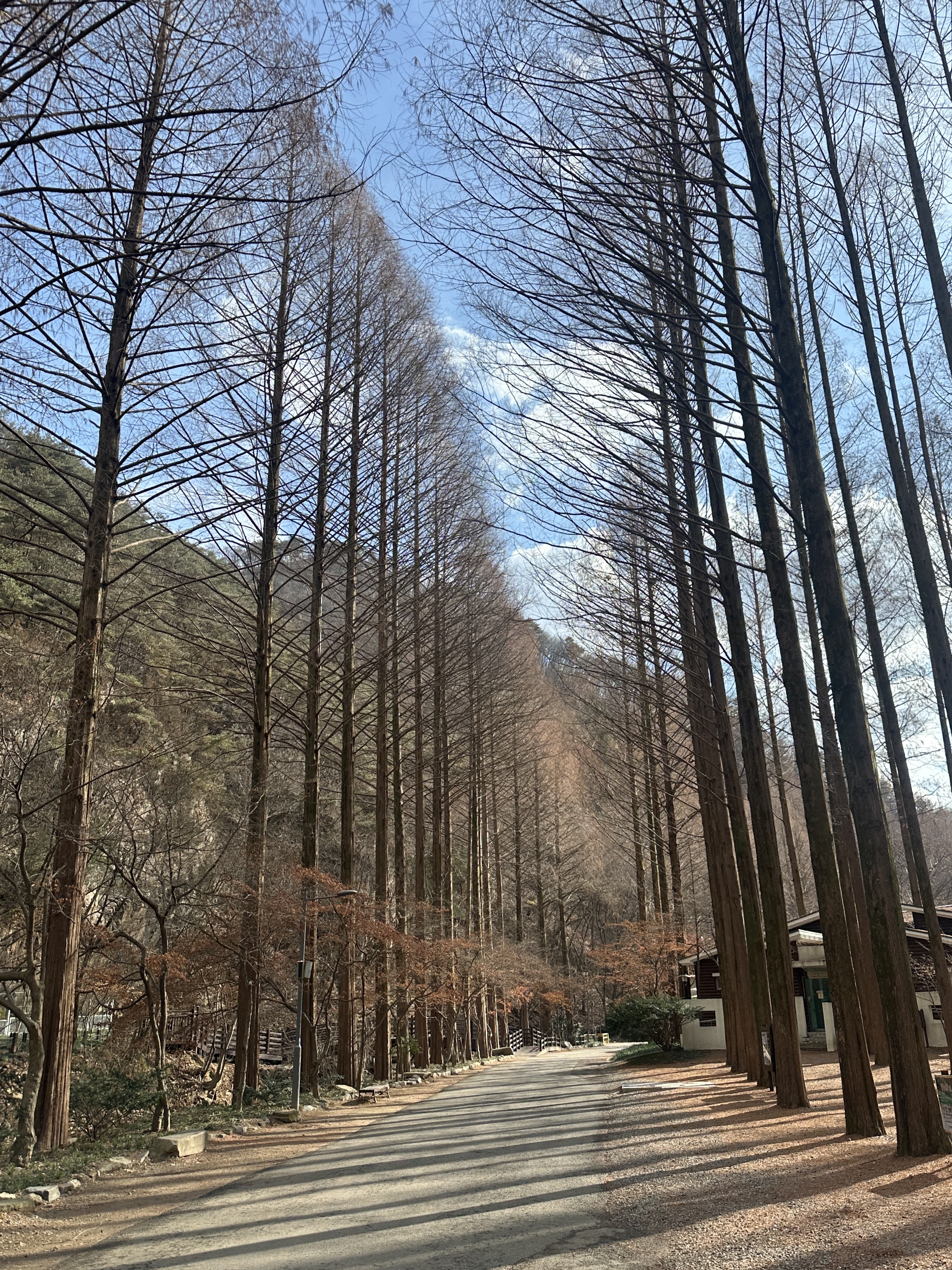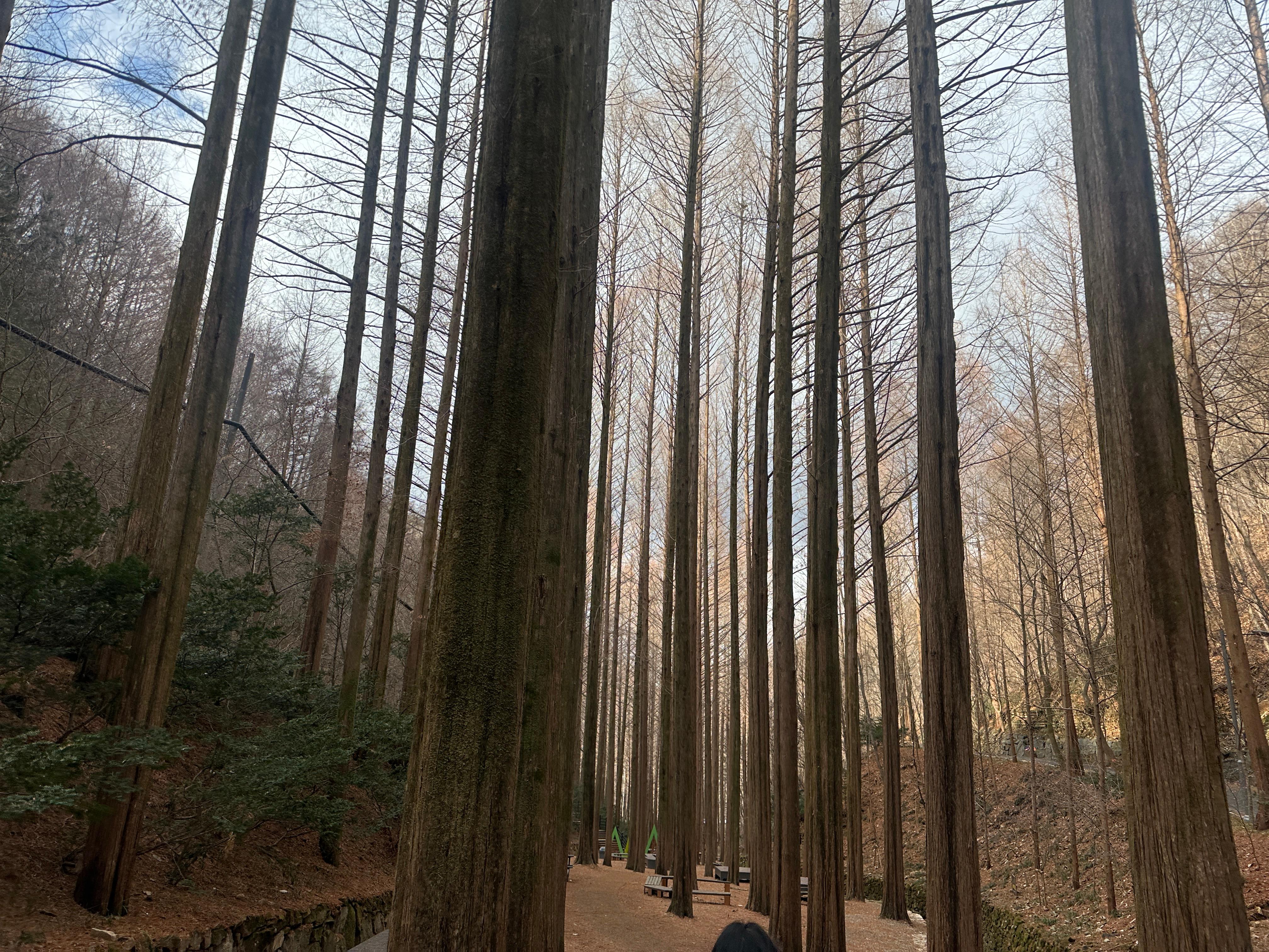 본래 가을 명소로 잘 알려져 있는 장태산 자연휴양림. 비록 가을은 아니지만 겨울에 들린 이날의 장태산에서의 첫 느낌은 겨울에도 와야 될 이유로 납득하기에 충분했습니다. 들어선 순간, 장태산의 가을 풍경을 알고 있는 제 머릿속엔 가을 풍경은 도무지 떠오르지 않았고, 그저 숲의 고요한 겨울 풍경만 넋 놓고 바라보게 되었으니까요. 하늘을 찌르듯 우뚝 솟아 있음과 동시에 길을 따라 간격을 맞춰 빼곡히 자리 잡고 있는 나무들을 보면 그 웅장함에 저절로 숨죽이게 됐고, 그 모습은 얼마 안 가, 고요함을 안겨주었습니다.
