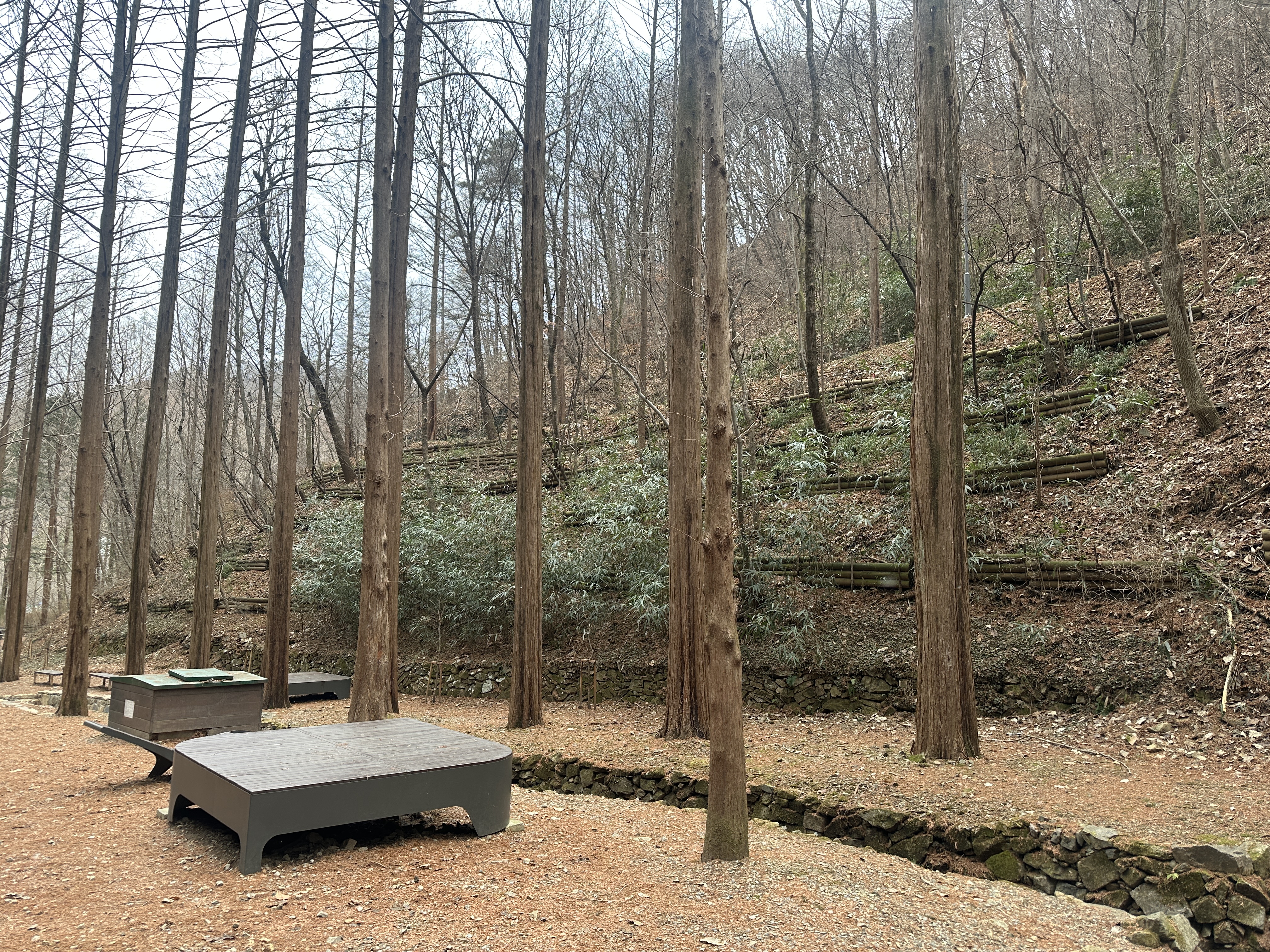 나무 데크를 따라 걷는 동안 밭 밑에서 들려오는 나뭇잎 소리, 그리고 그 나뭇잎 소릴 따라 걷다 보니 마주한 곳곳의 쉼터들. 시간이 허락한다면, 책 한 권 들고 와 책도 읽고, 늘어져도 보고, 낮잠까지 자보고 싶어졌습니다. 이 추운 겨울에도 이런 욕심이 생기는 걸 보면, 장태산 자연휴양림은 온도를 잊게 만드는 편안한 안식처 같다는 생각이 들었습니다.