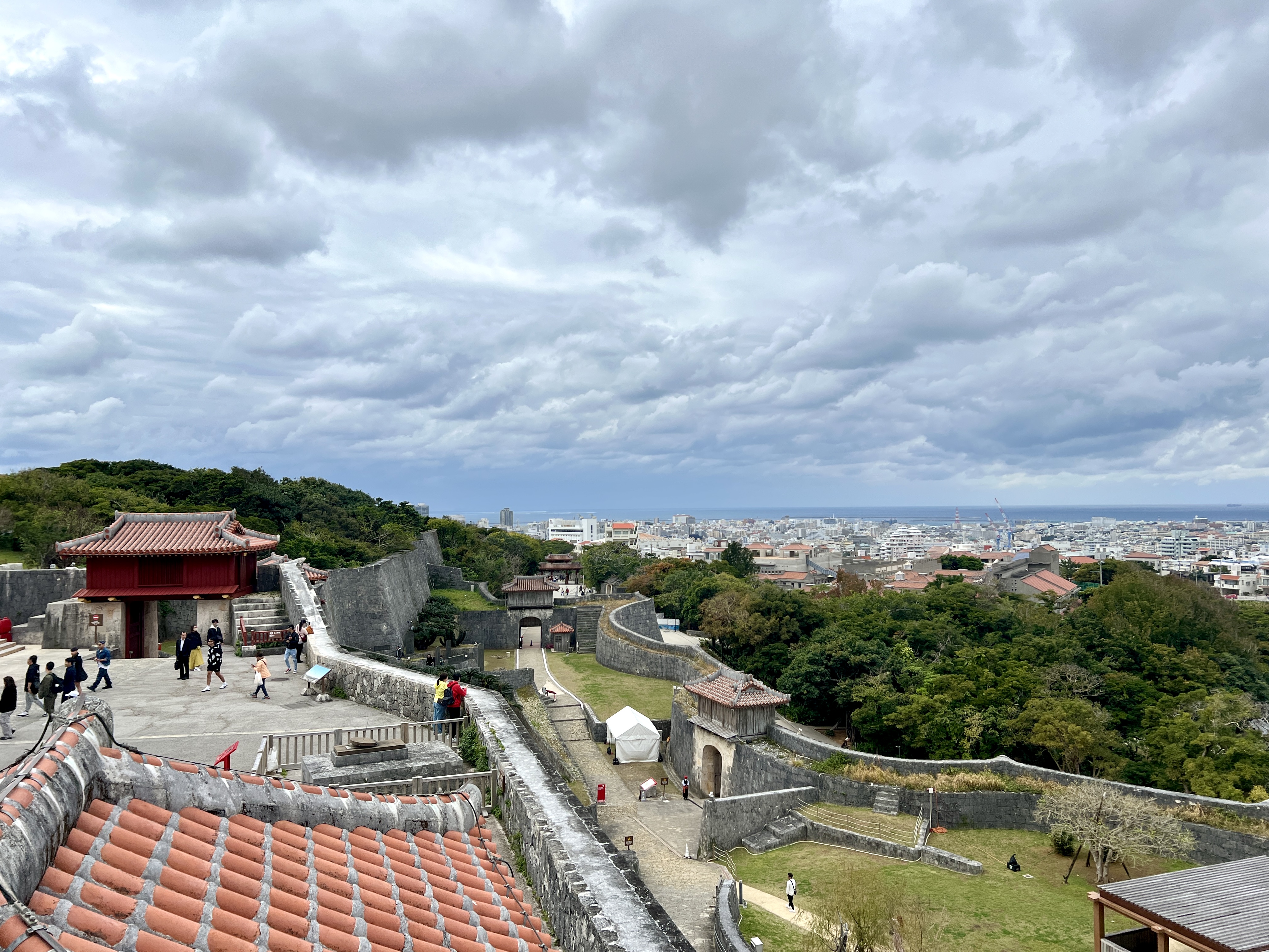 슈리성은 높은 언덕에 자리 잡고 있어 나하 도시가 한눈에 내려다보여요. 곡선을 그리듯 성벽에 둘러싸였고 그 안에 여러 시설이 세워져 있습니다.
