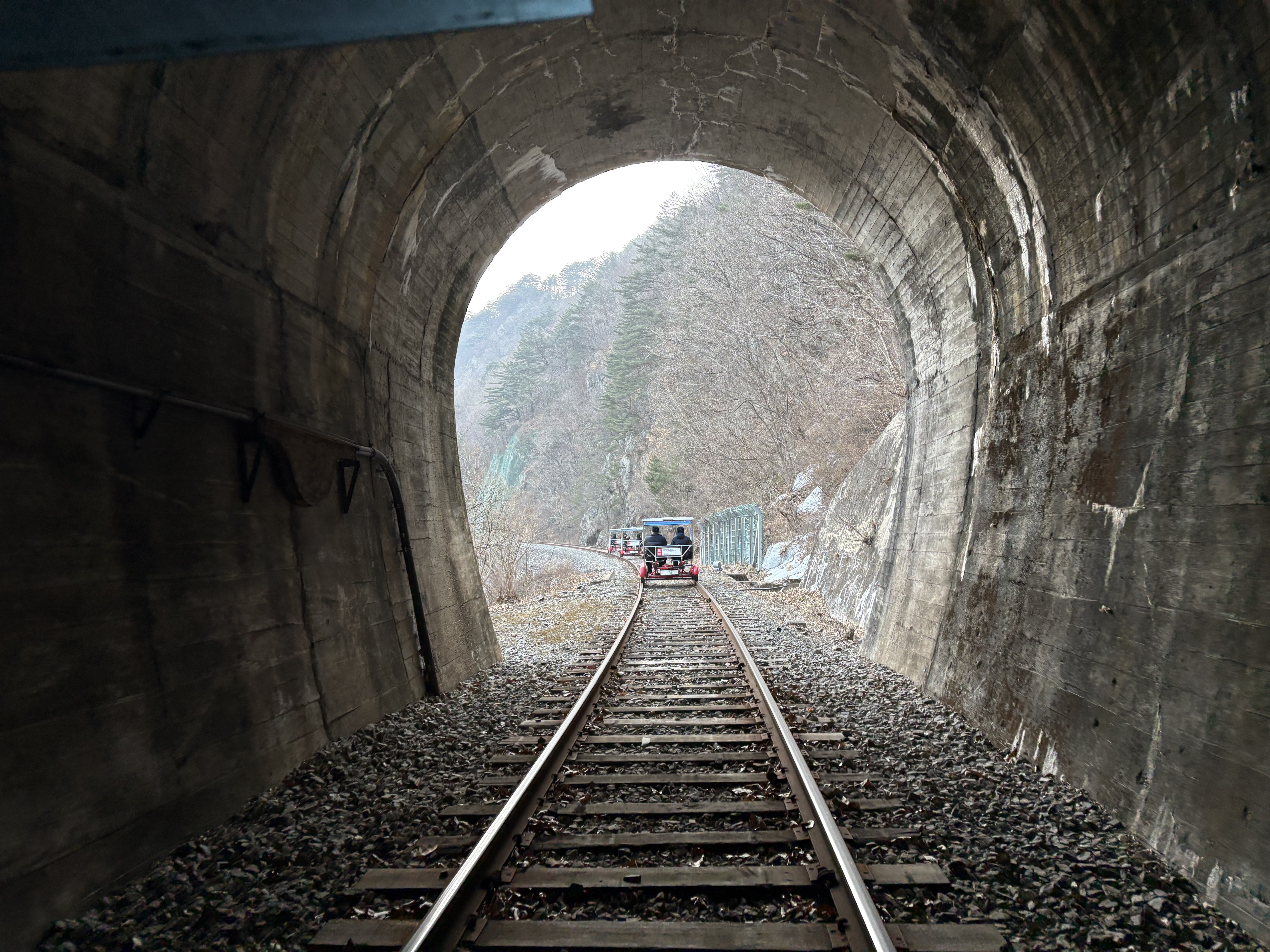 시간이 되어, 드디어 레일바이크에 올라타 힘차게 페달을 밟으며 출발하였습니다. 여전히 겨울이라 찬바람이 얼굴을 다소 시리게 하였지만, 레일바이크를 타고 지나오며 바라본 풍경 덕분에 그 시린 정도가 크게 불편하게 느껴지진 않았습니다. 레일바이크 구간에는 총 3개의 터널 구간이 있는데, 이 터널을 지날 때마다 마치 영화의 한 장면이 떠올랐습니다. 어떤 역경을 뚫고 지나, 끝내 빛이 들어오는 구간에 진입하는 그런 장면들. 영화 속 장면들을 몸소 체험해 보며, 저의 인생도 빛이 드는 구간을 향해 질주 중이라고 대입해 봅니다