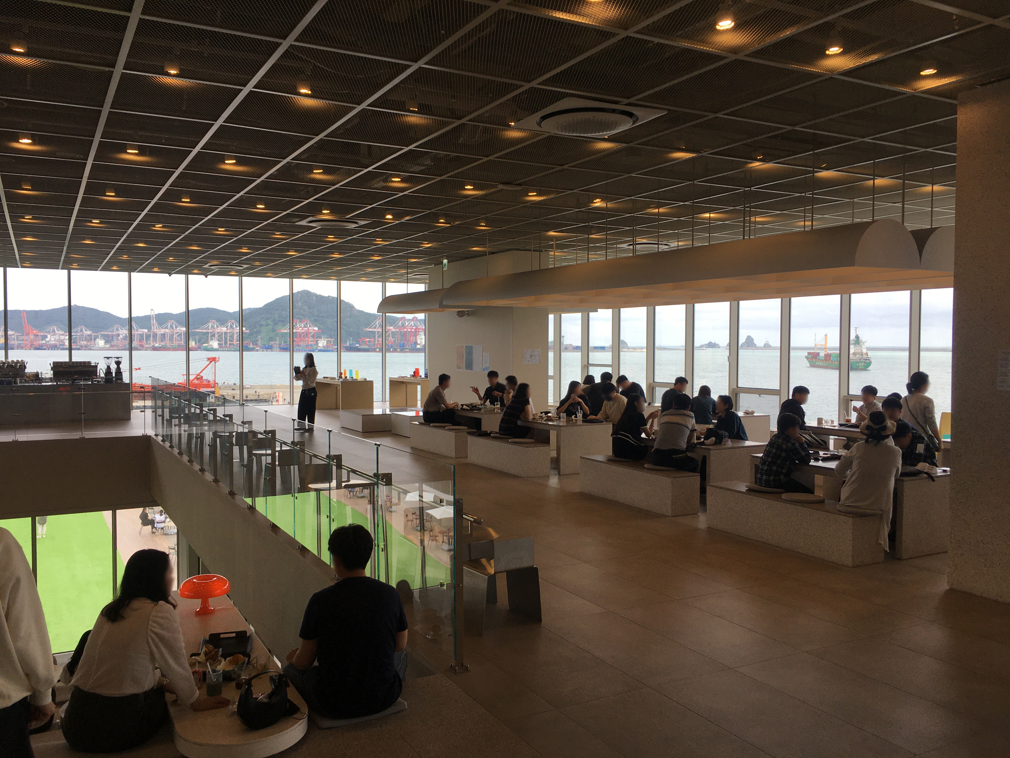 처음 방문하는 대부분 사람들의 행선지는 4층 카페&베이커리예요. 첫 인상은 시원한 개방감입니다. 에스컬레이터나 엘리베이터를 타고 카페에 도착하면 확 트인 공간에 탄성이 절로 나와요. 부산항대교가 놓인 부산항과 오륙도 배경의 오션뷰가 장관이죠.