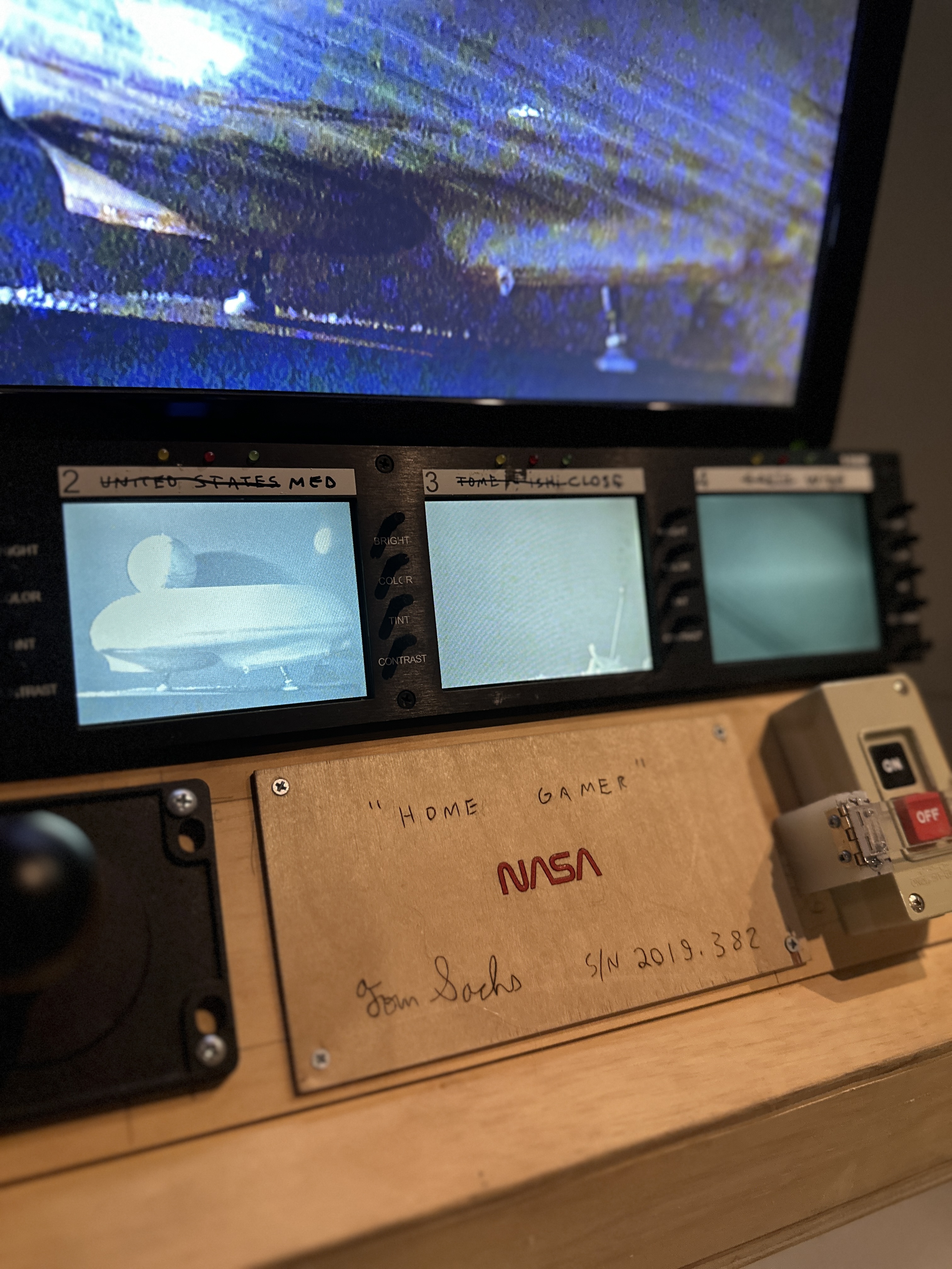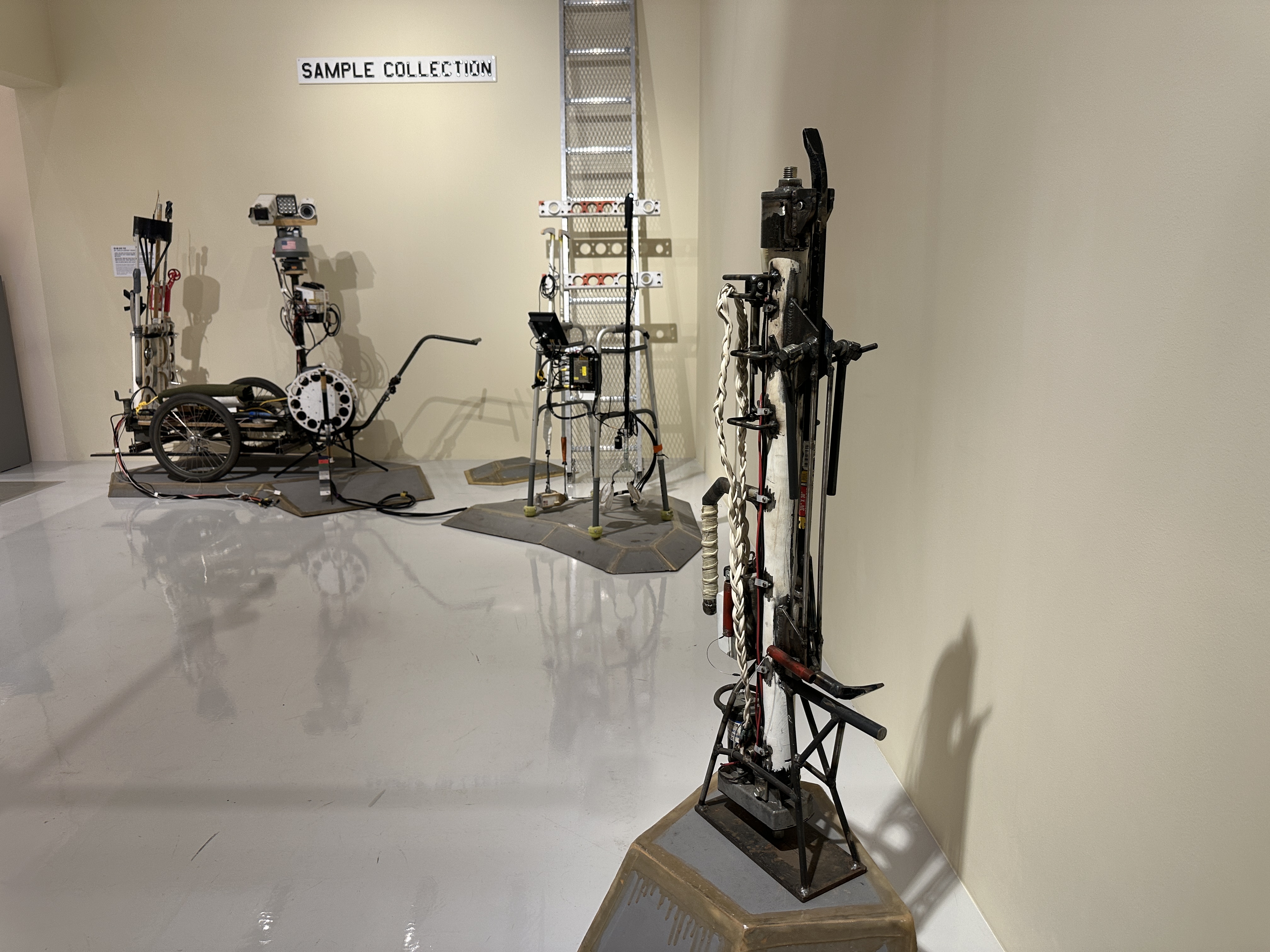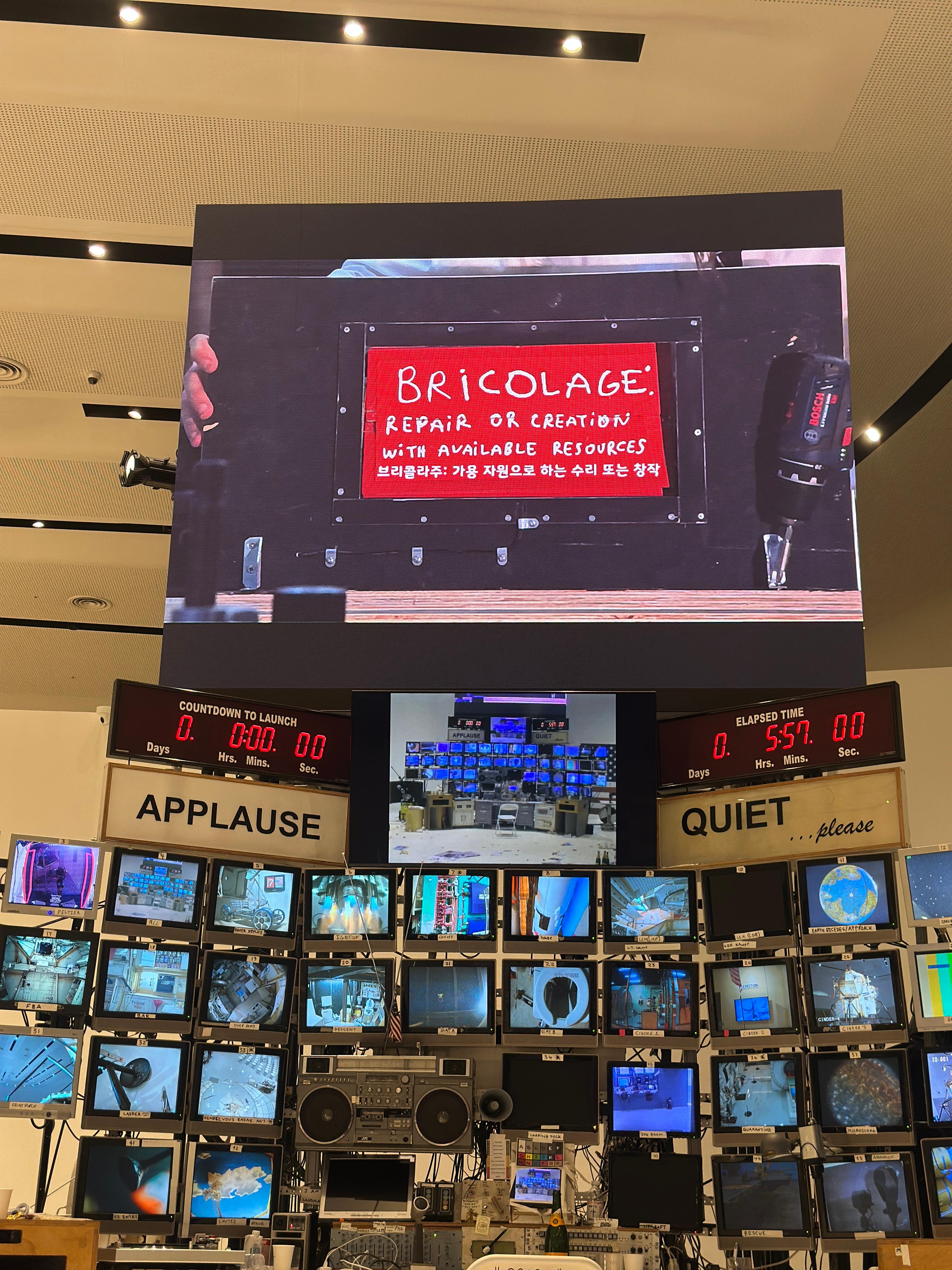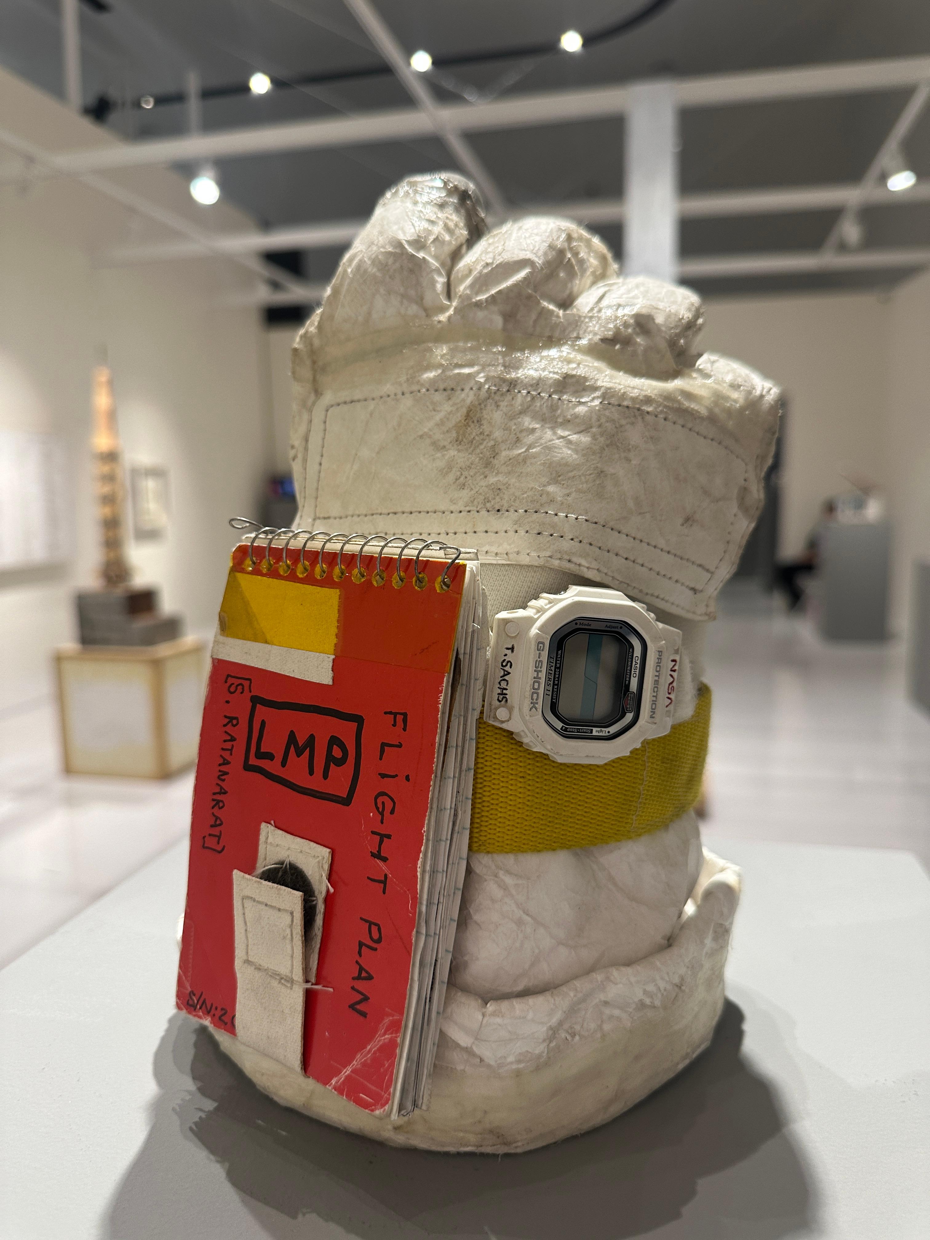 그간 촬영된 비디오 속에서 우주인들이 착용했던 헬멧과 장갑, 우주복 등도 실제 전시 공간에 전시되어 있었는데요, 가까이에서 들여다보니 테이프, 글루건, 수첩, 벨크로 등 아주 일상적인 재료들로 러프하게 제작되어 있었습니다. 브리콜라주 기법을 보여주는 이 장비들은, 기능보다는 형태와 상징성을 우선한 예술적 해석으로 완성되었고요. 우주 탐사의 엄밀한 기술적 장비가 아닌, 예술가의 상상과 손의 감각이 담긴 도구처럼 느껴졌습니다.
