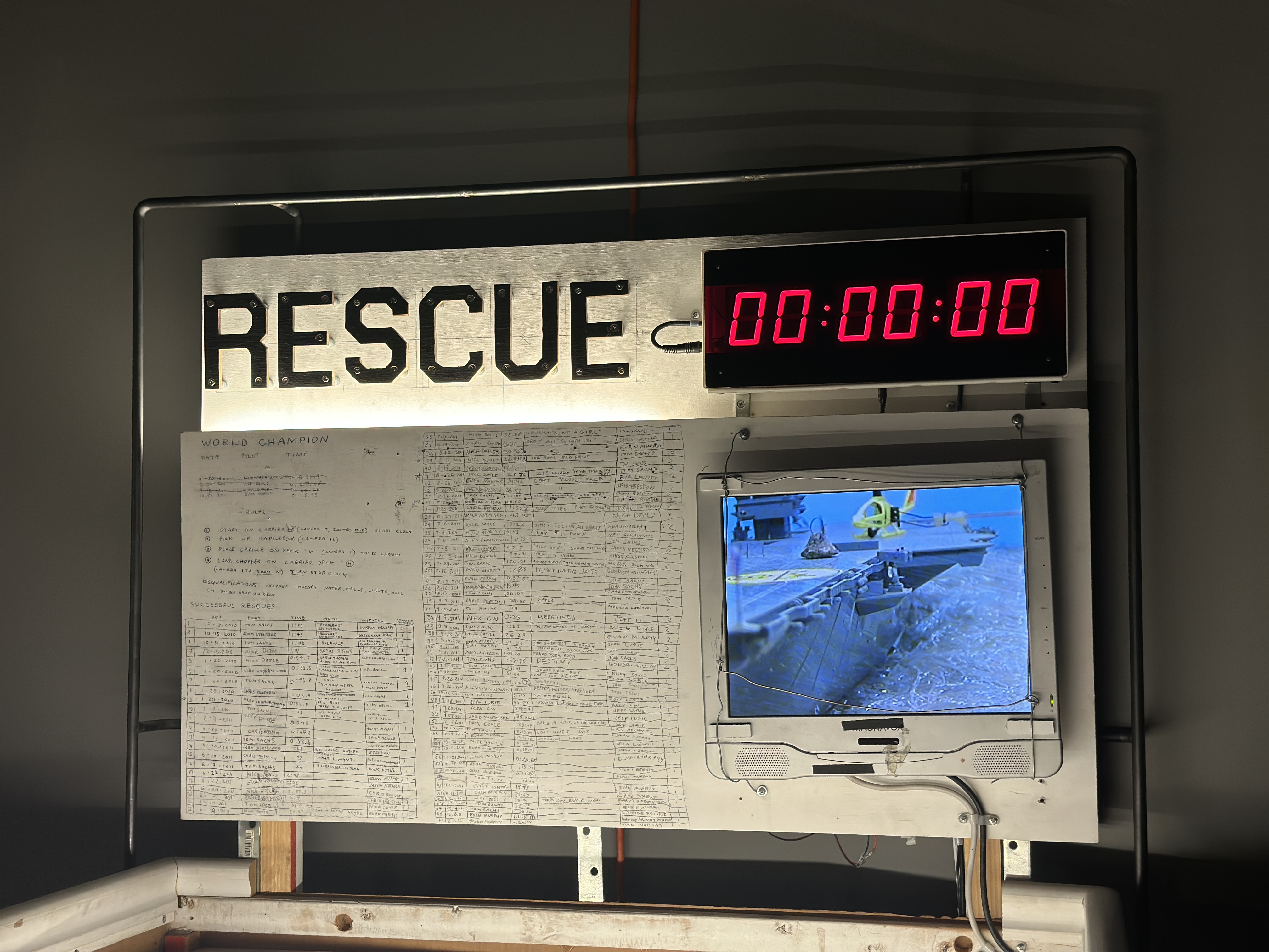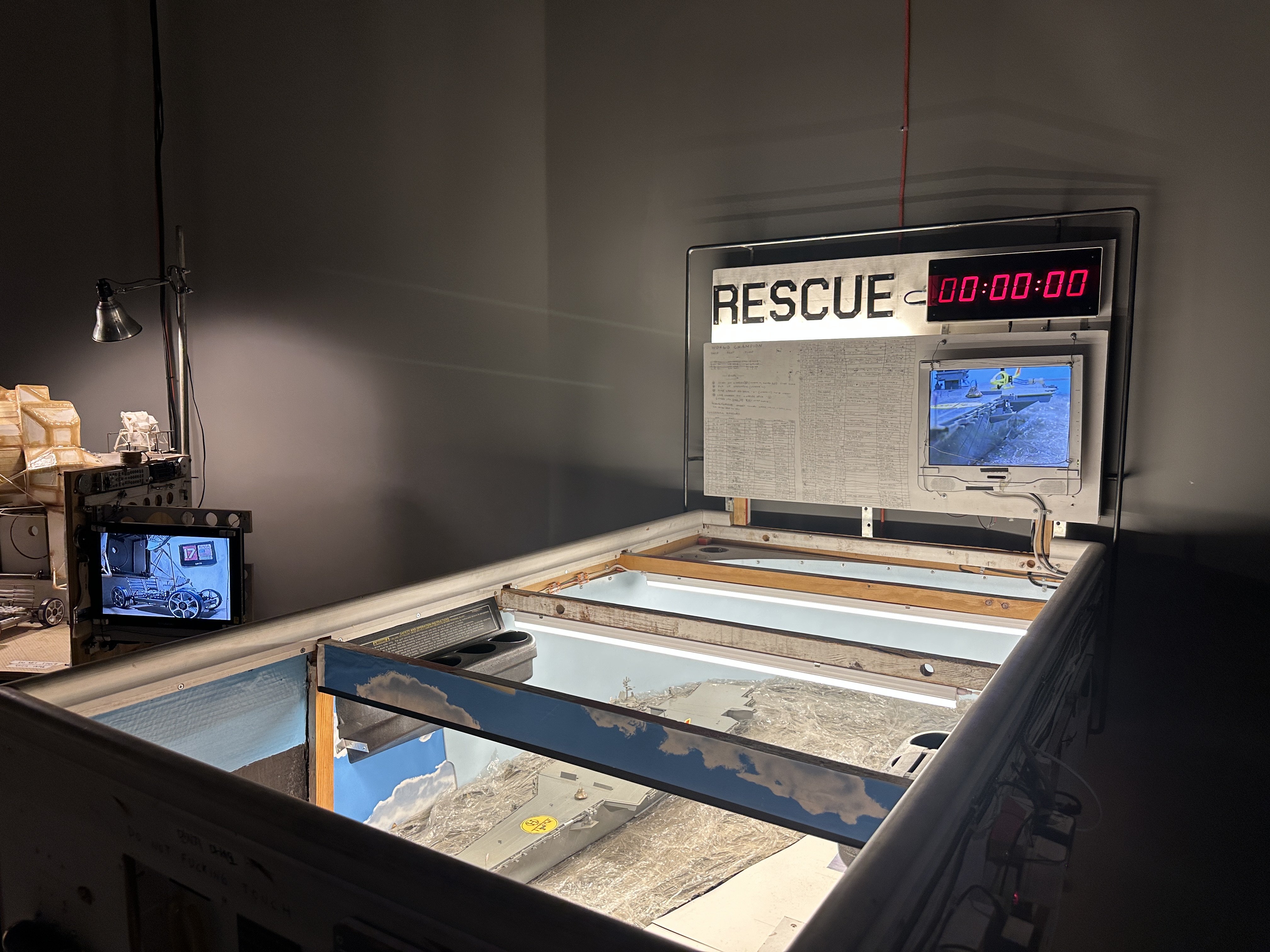 이 작품은 우주인을 태운 캡슐의 귀환 과정을 보여주는 장면을 촬영하기 위한 설치물입니다. 이 설치물은 마치 하나의 단편 영화 세트를 옮겨온 듯한 구조로, 낙하산이 펼쳐지며 대기권으로 진입하는 장면부터 시작해, 바다 위에 무사히 안착한 캡슐, 그리고 이를 구조하기 위해 접근하는 헬리콥터까지의 흐름이 순차적으로 연출되도록 설계되어 있죠.