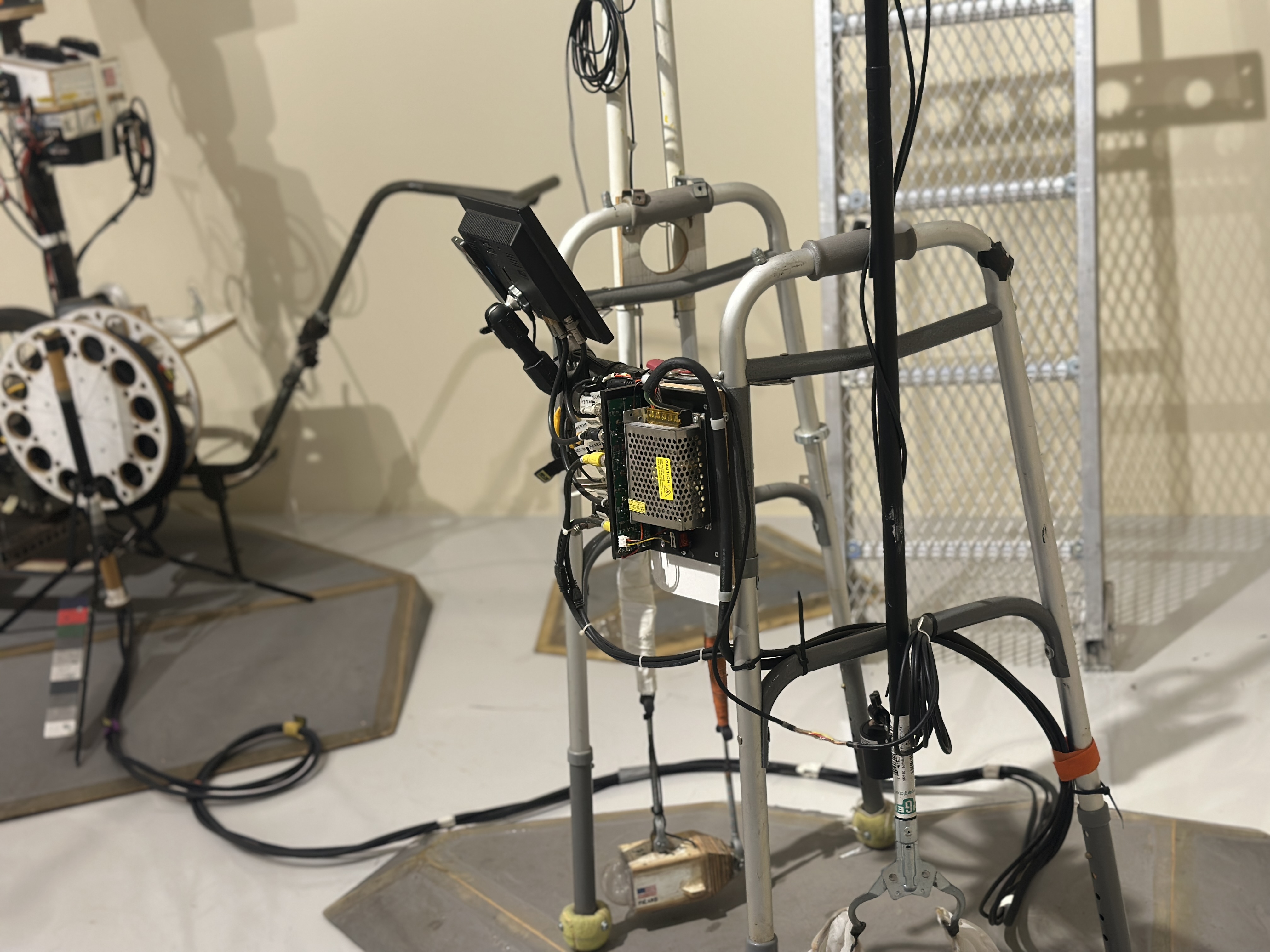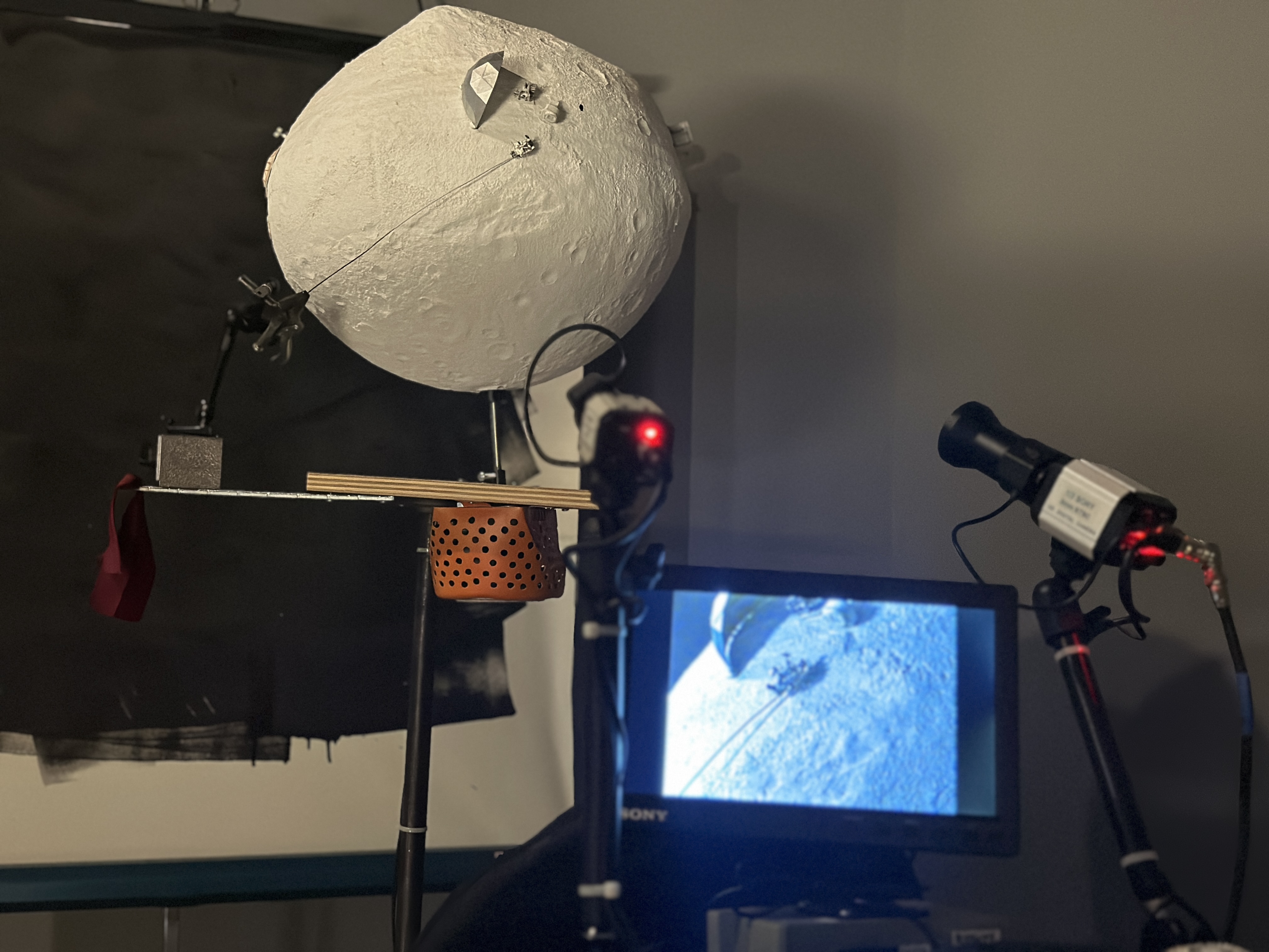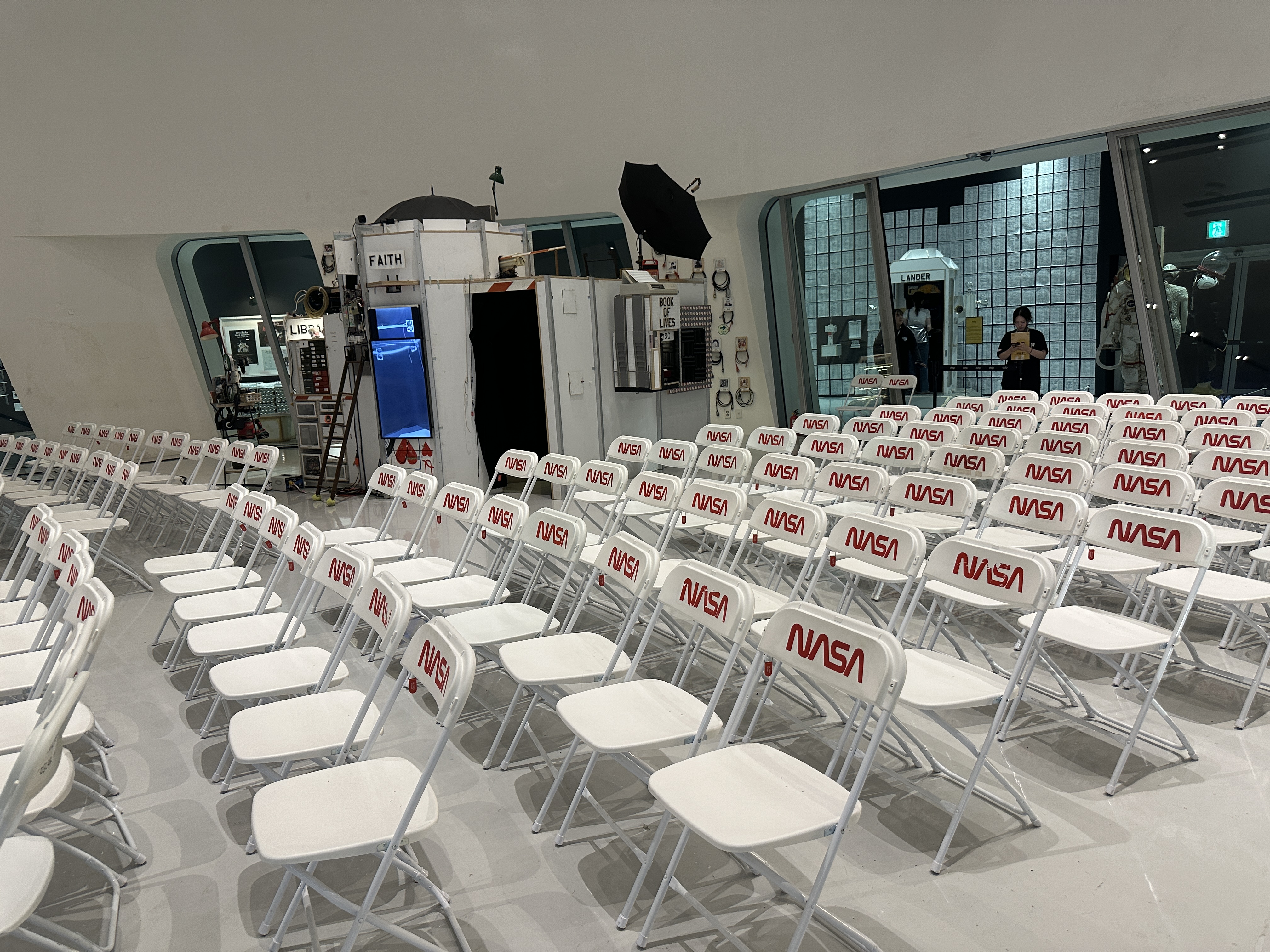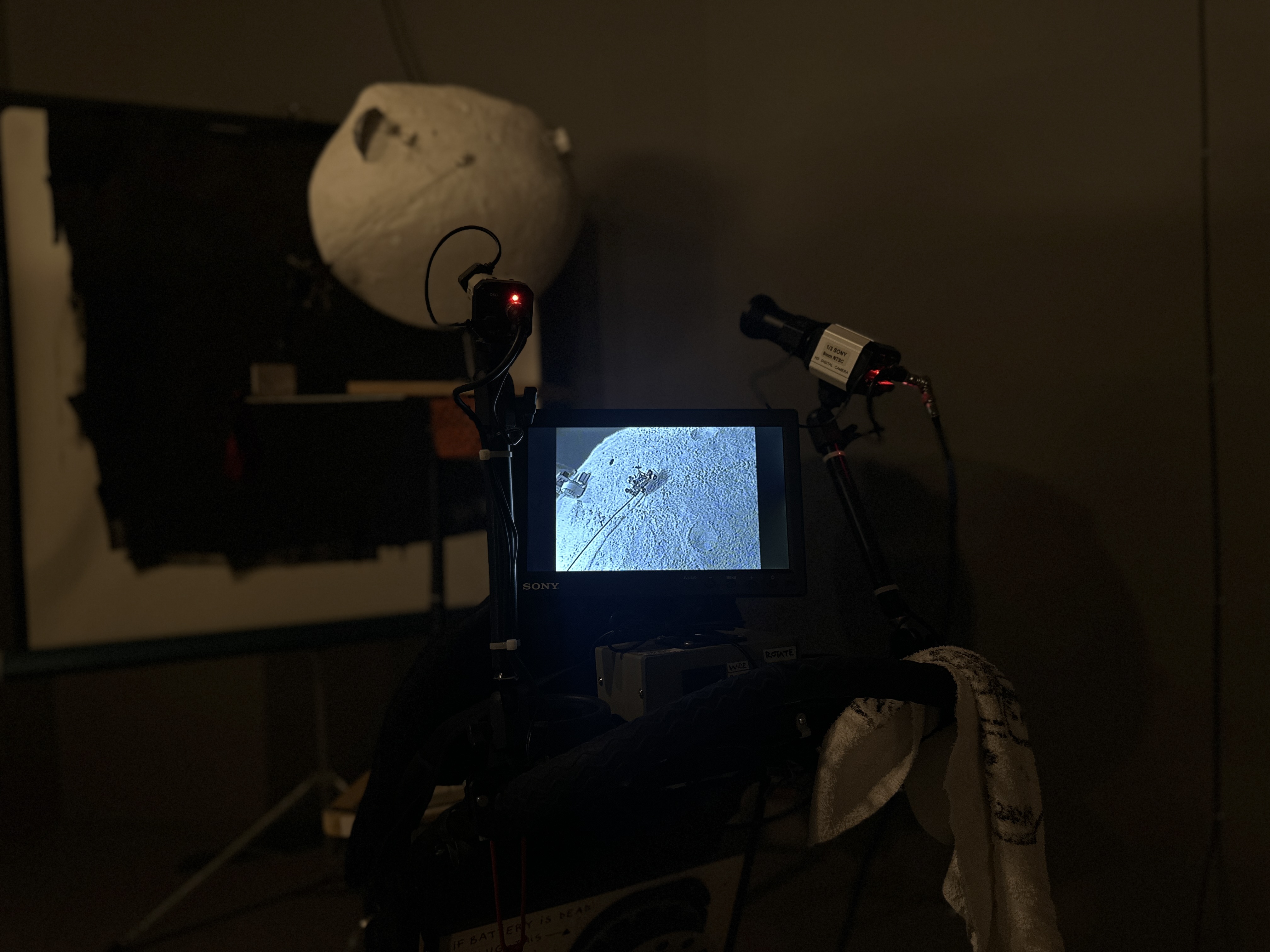 그중에서도 특히 인상 깊었던 장면은, 달 탐사 장면을 촬영하기 위해 휠체어를 개조해 만든 카메라 리그였습니다. 일반적인 영상 장비가 아닌 휠체어라는 일상적이고도 의외의 오브제를 활용했다는 점에서, '가능한 도구로 상상 가능한 모든 것을 실현한다'는 톰 삭스의 철학이 고스란히 드러났죠. 휠체어에 고정된 카메라는 달 표면을 모사한 세트를 따라 부드럽게 움직이며, 실제 탐사 로버의 시점을 연출해 줍니다. 누군가는 불가능하다고 생각할 장면을, 가장 간단한 방식으로 구현한 이 장치는 그 자체로 예술적 상상력과 실용성의 조화를 보여줍니다.