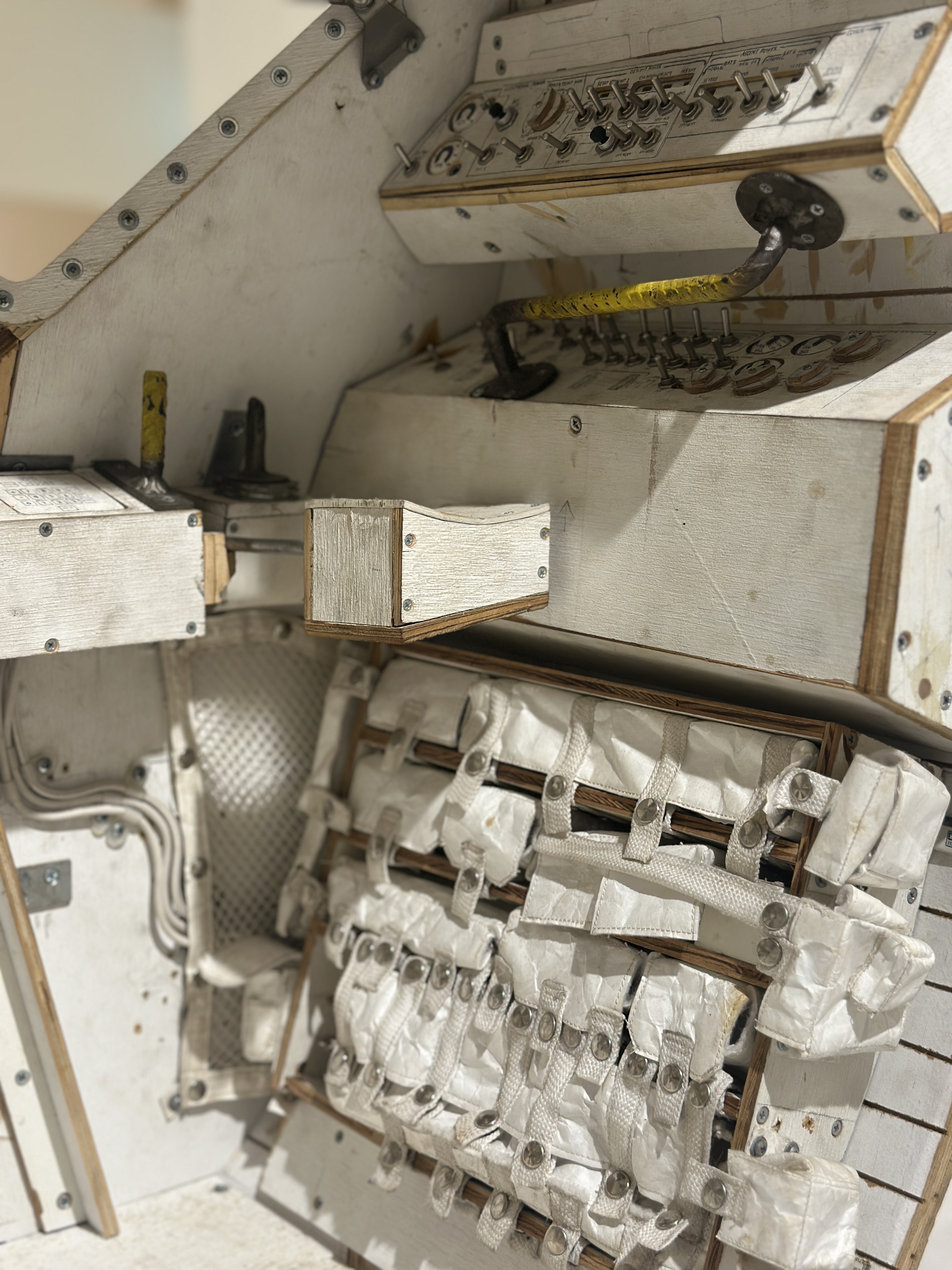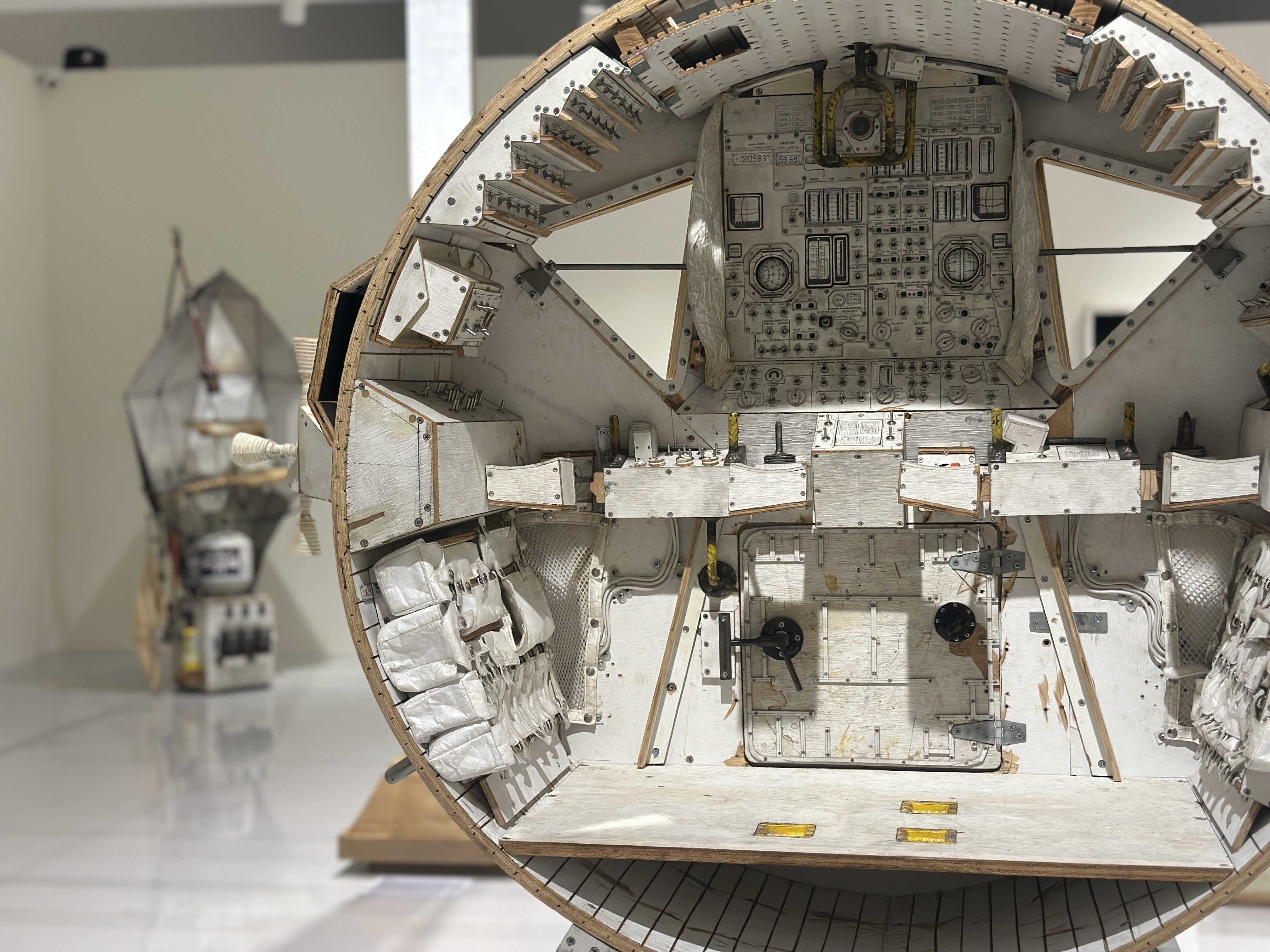 달 탐사선은 톰 삭스의 대표적 제작 방식인 브리콜라주 기법을 활용해 만들어졌습니다. 합판의 거칠고 투박한 결이 그대로 드러나 있으며, 덕트 테이프, 철사, 볼트 등이 그대로 노출되어 있어 공장에서 대량 생산된 오브제가 아닌, '손으로 만든 우주선'이라는 인상을 강하게 남깁니다. 그런데 흥미로운 점은, 외부 구조가 투박하고 실험적인 반면, 내부 조정석은 반대로 굉장히 세밀하게 구성되어 있다는 점인데요. 작은 버튼 하나까지 손으로 정성스레 만든 흔적이 느껴지고, 디스플레이나 레버, 케이블 하나하나에도 치밀한 디테일이 살아 있어 외부와 내부가 극명한 대조를 이루며 강한 시각적 긴장감을 자아냅니다.