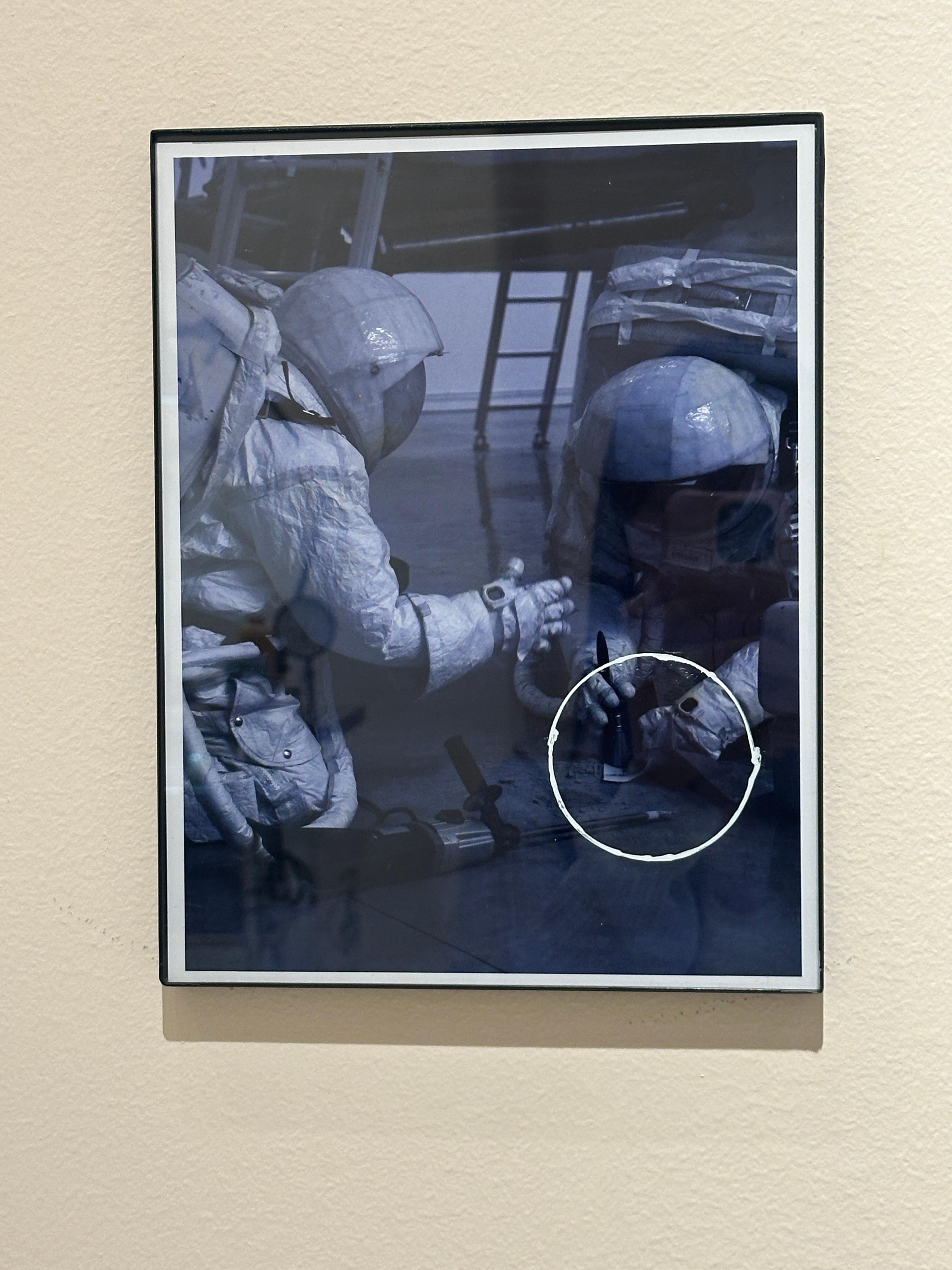 우주복을 입은 여성의 인화된 사진을 활용해, 마치 실제 우주비행사가 행성을 탐사하며 활동을 남긴 듯한 형식을 빌려 연출한 장면이었습니다. 과학적 기록처럼 보이지만, 인물의 표정과 포즈, 배경의 연출이 예술적으로 재구성되어 있어 사실성과 유머 사이를 자유롭게 넘나드는 그만의 미학이 느껴졌습니다.